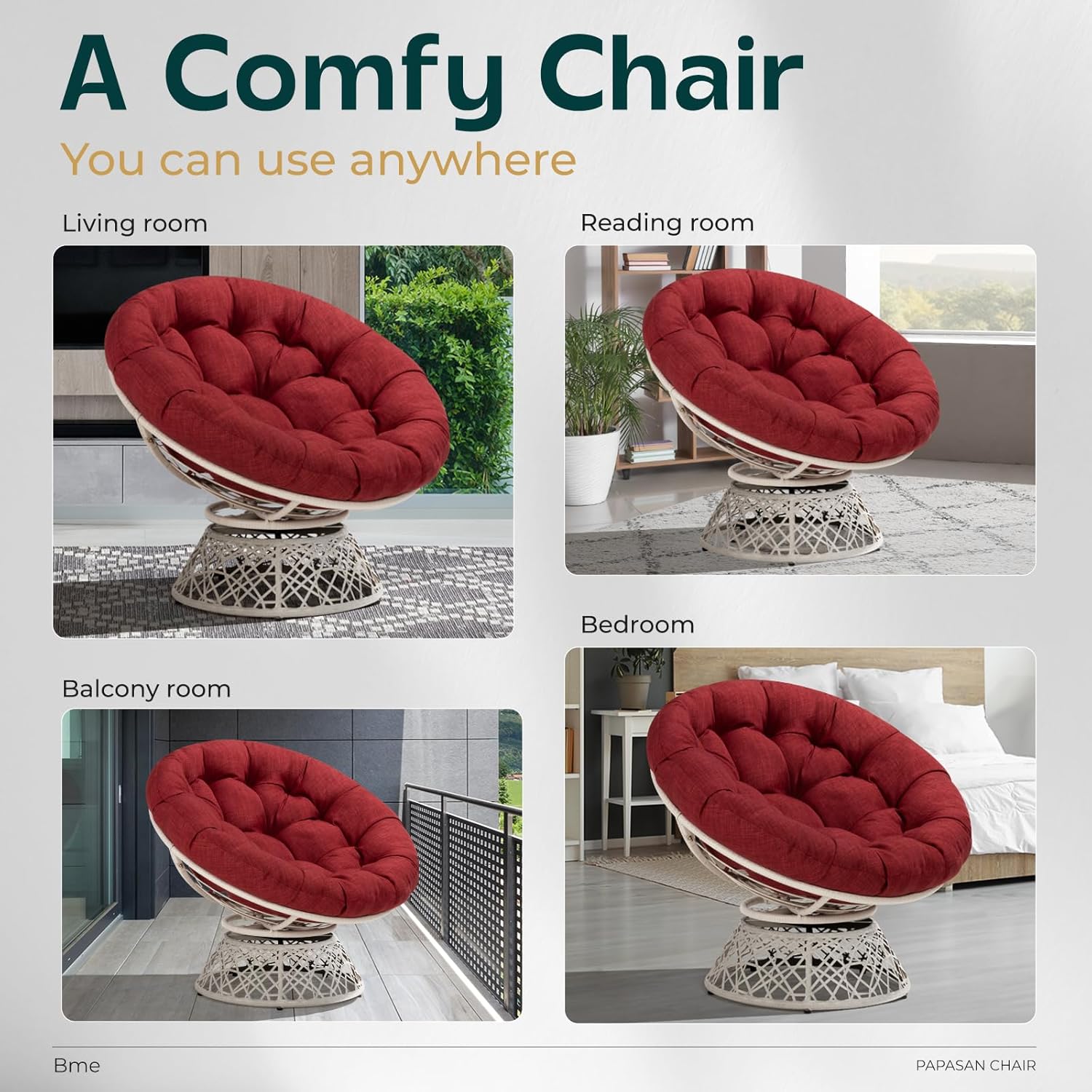 Bme 40" Ergonomic Wicker Papasan Chair with Soft Thick Density Fabric Cushion, High Capacity Steel Frame, 360 Degree Swivel for Living, Bedroom, Reading Room, Lounge, Cherry Sangria - White Base