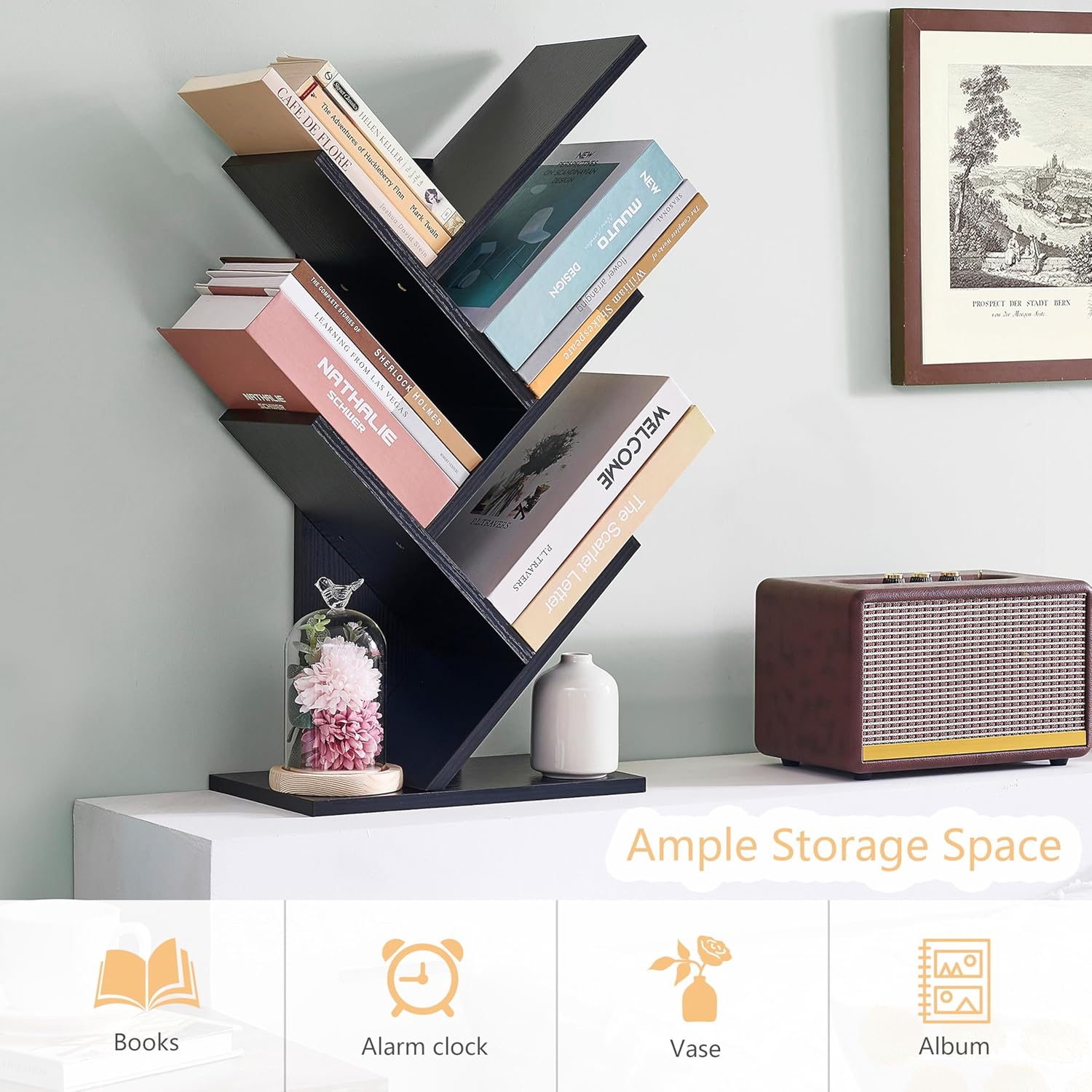 Hoctieon 4 Tier Tree Bookshelf, 4 Shelf Bookcase, Free Standing Tree Bookcase, Display Floor Standing Shelf for Books, Book Organizer Shelves for Home Office, Living Room, Bedroom, Black