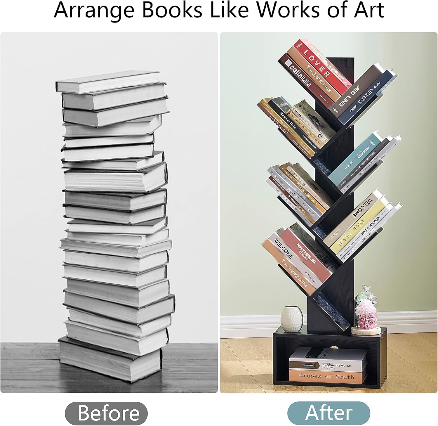 - [Space Saving and Ample Storage Capacity] Our 6-tier tree bookshelf offers 6 open shelves and a large drawer for storage. Whether it's books, decorations, CDs, magazines, video games, manga, novels, speakers, potted plants, photo albums, crafts, or other collections, you can easily organize them on this bookcase. With its narrow design, it can be moved easily to any corner or small space.