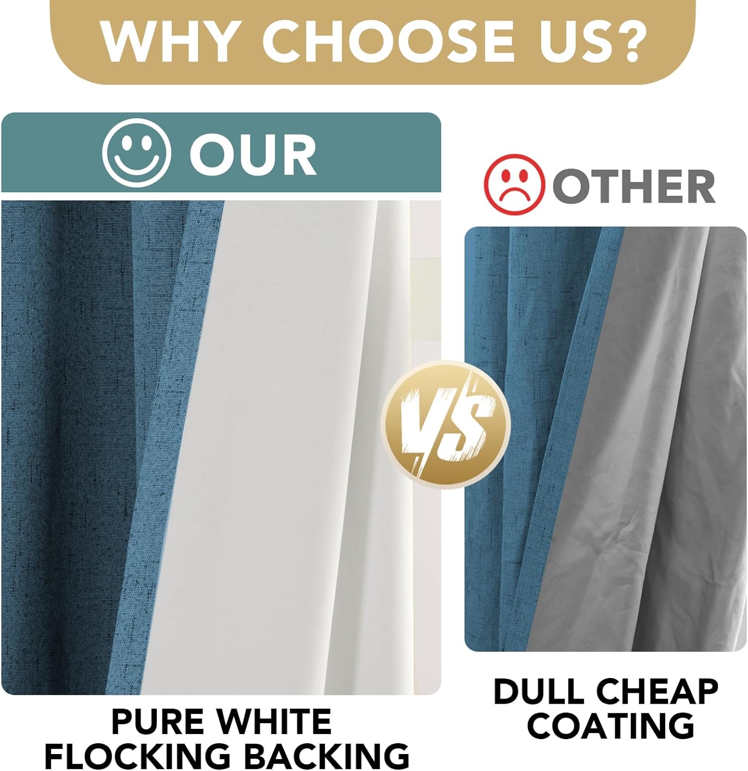 - INNOVATED MATERIAL: These casual linen draperies are crafted from rich linen like fabric (100% polyester), added with 100% blackout lining, draped and soft, block the wind and reduce the noise. Lab test shows these awesome curtain panels are environmental and vinyl free