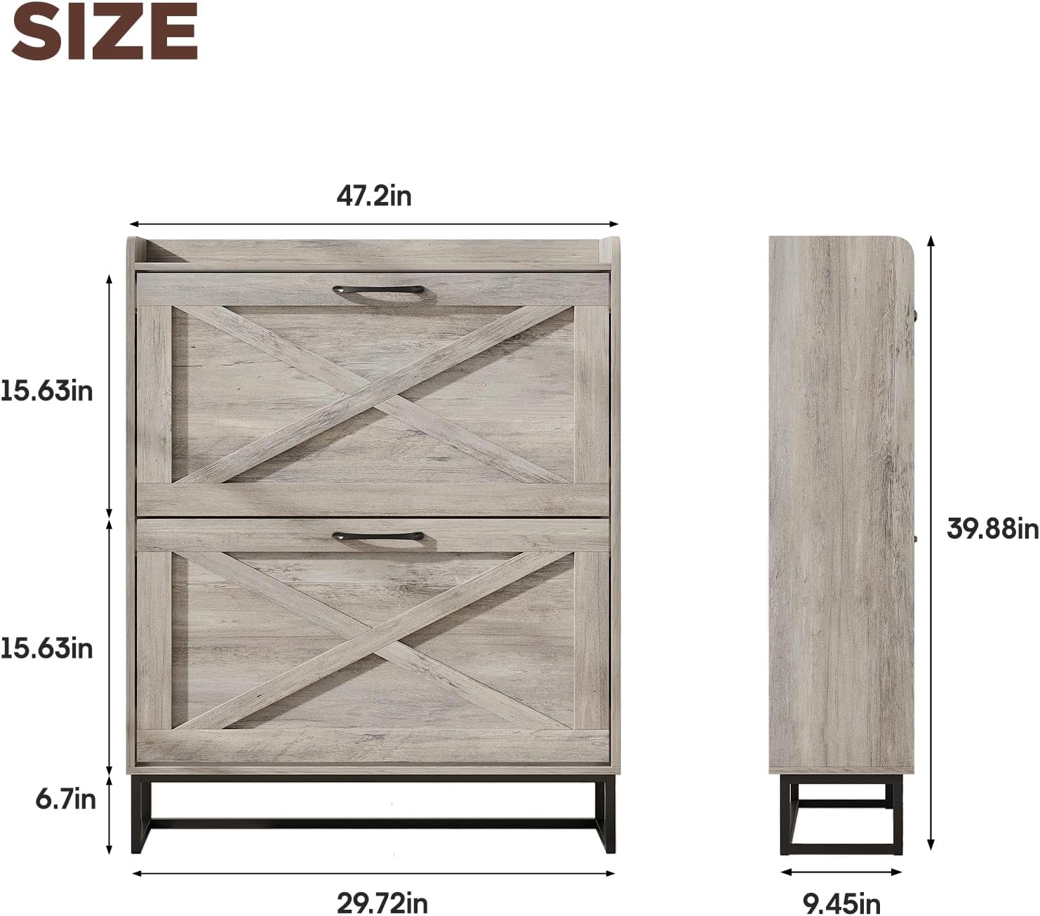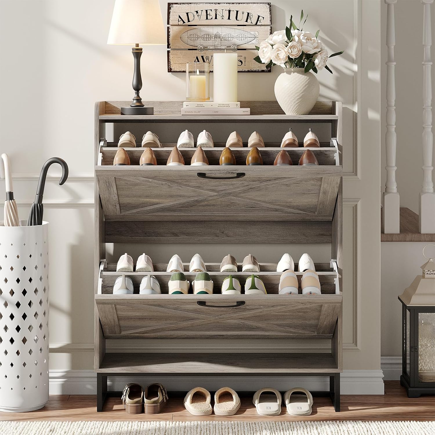 - Entryway Shoe Cabinet: The hidden shoe storage cabinet with 2 flip doors, stylish and simple washed gray makes it a neat and beautiful finish and looks great in many different home styles. Perfect for placing in the entryway, hallway, living room, or porch, provides a neat looking in your home and space saving