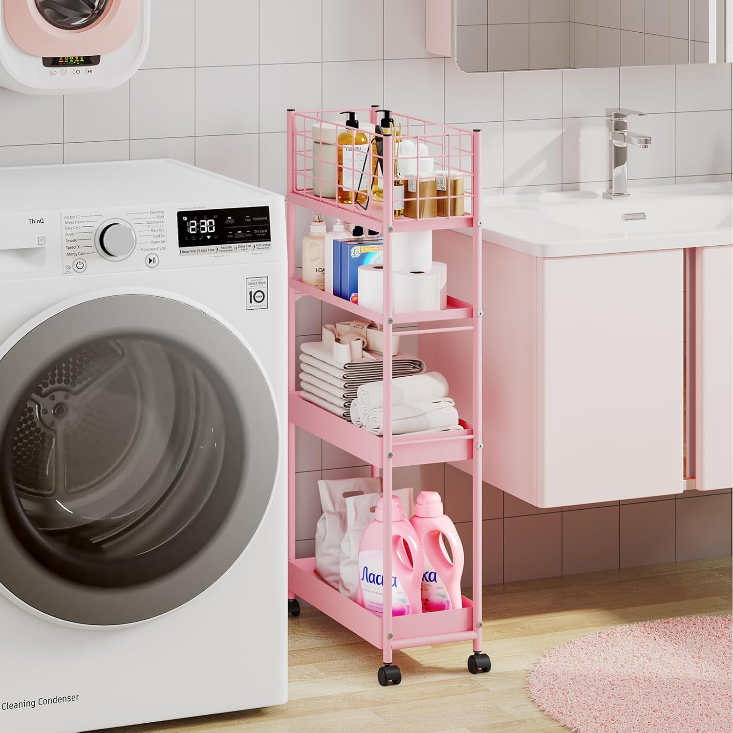 KINGRACK Slim Storage Cart, 4-Tier Metal Utility Rolling Cart with Wheels,Bathroom Organizer, Skinny Rolling Trolley, Mobile Shelving Unit for Office, Laundry Room, Narrow Place,Pink