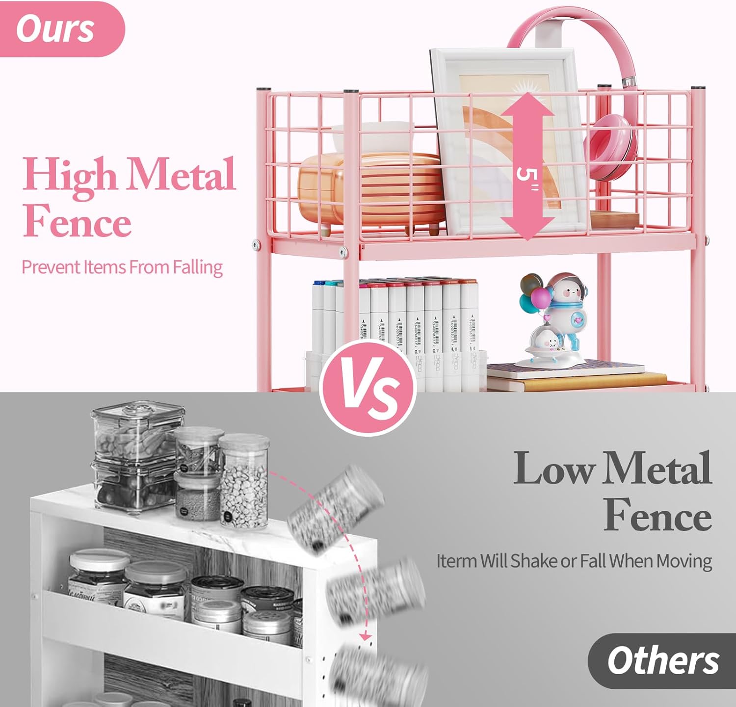 - UNIQUE HIGH MESH GUARDRAIL: Adorable mesh top design make this rolling cart have fashion and beautifle look. The mesh top not only allows you to use the hooks and place a lot of good -looking things, but also support you with paper clips display your photographs on mesh top to satisfy the students' daily use in the dormitory, add fun to your school life. You can discover more use methods and interesting ideas in the process of using this cart.