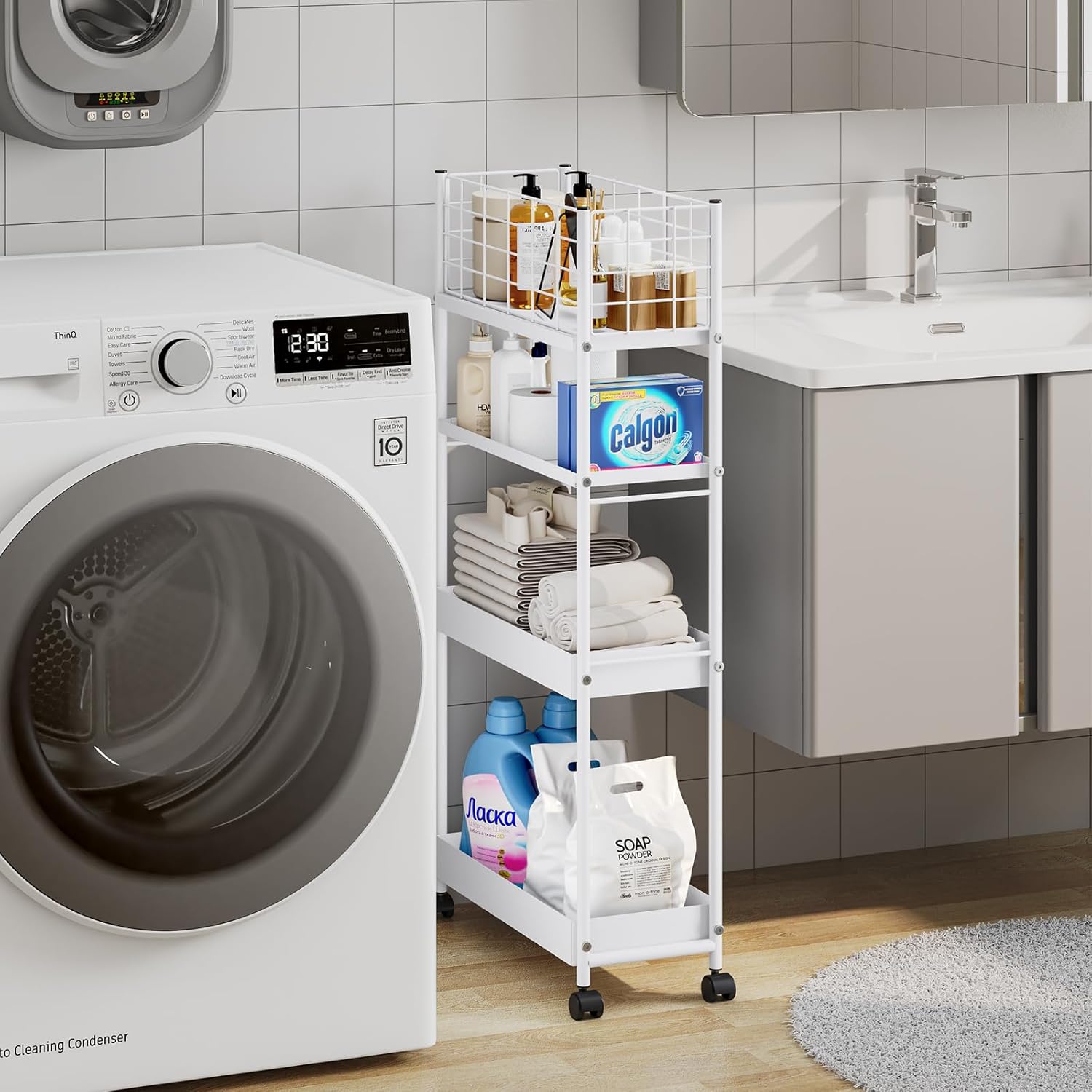 KINGRACK Slim Storage Cart, 4-Tier Metal Utility Rolling Cart with Wheels, Narrow Mobile Shelving Unit, Bathroom Storage Organizer, for Office, Kitchen Bathroom, Laundry Room, Narrow Places, White