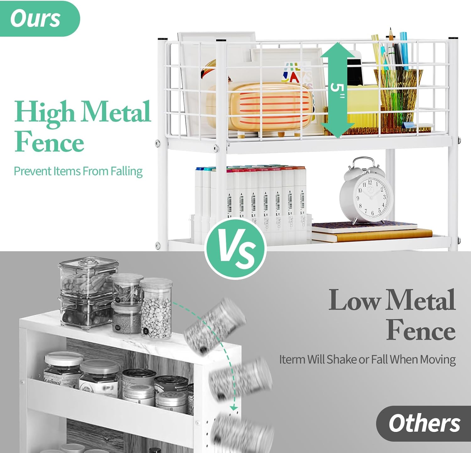 - UNIQUE HIGH MESH GUARDRAIL: Adorable mesh top design make this rolling cart have fashion and beautifle look. The mesh top not only allows you to use the hooks and place a lot of good -looking things, but also support you with paper clips display your photographs on mesh top to satisfy the students' daily use in the dormitory, add fun to your school life. You can discover more use methods and interesting ideas in the process of using this cart.