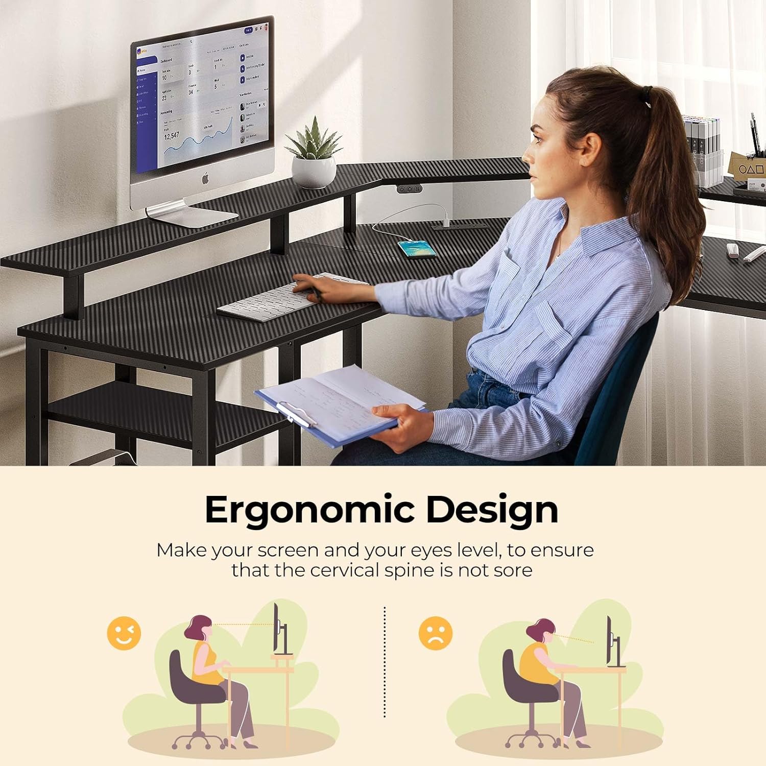 - Spacious Working Area: This L shaped corner desk includes 2 spacious desktops that provide plenty space for your home office. 18.5"D x 53.0"W x 46.2"Wx 34.1"H wide desktop provides ample space for 2-4 monitors. The detachable full monitor stand reserves more space for your desktop, which greatly improves the utilization rate of the desktop. Compared to other L shaped computer desks, this L shaped computer desk adds under-table storage shelves to provide you with more storage space