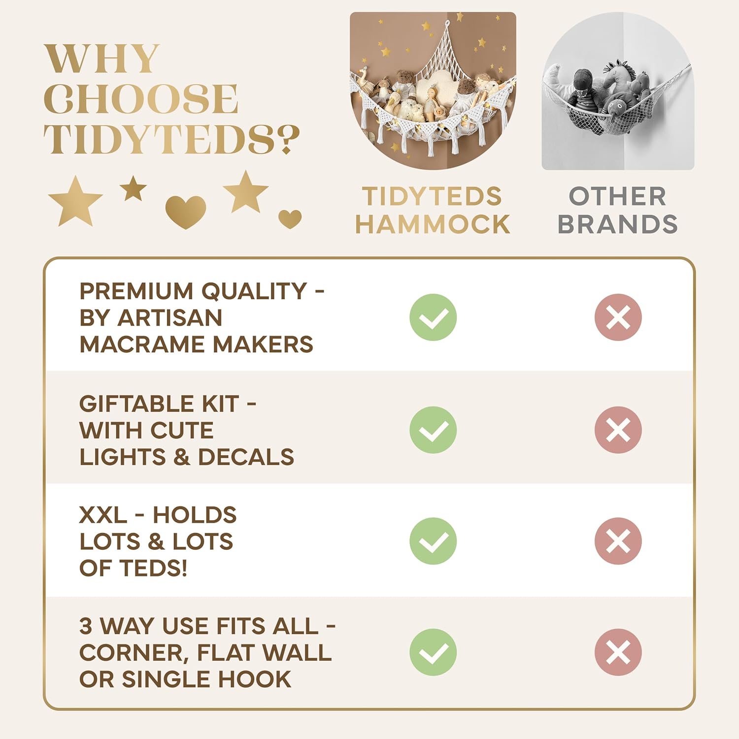 - SWEET DREAMS AND TIDY TEDS! Plushies love putting themselves to bed after a long day of playing and snuggling! And the TIDYTEDS Little Star Dreamlights Stuffed Animal Hammock makes it easier than ever before! This jumbo corner storage can hang 3 ways! Corner, flat wall or even on the back of the door! A very cute solution to clearing the clutter!
