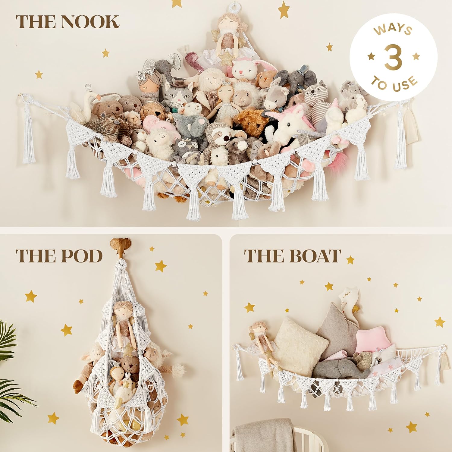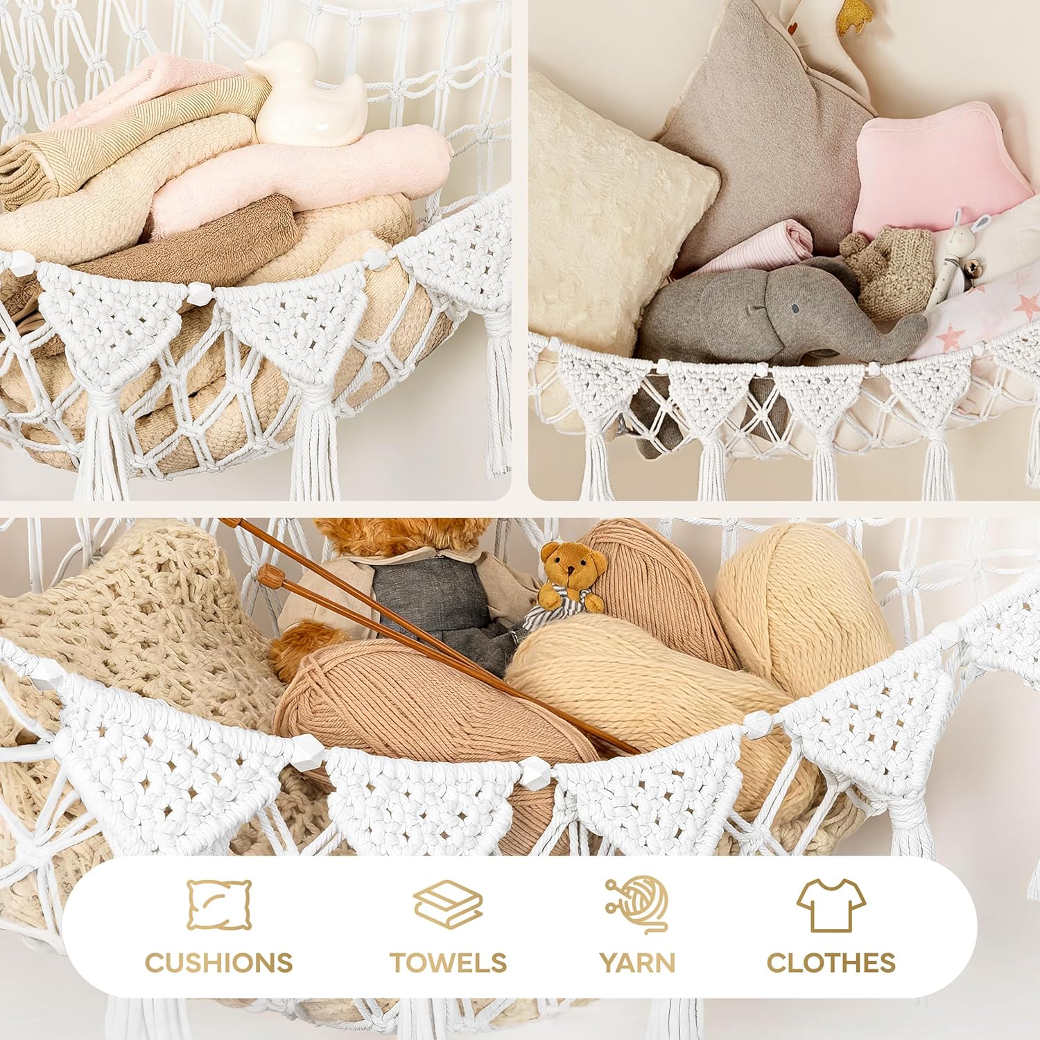 - UPGRADED AESTHETIC STORAGE: For a boho nursery or boho kids’ decor this triangle hammock makes sense. Bunting in front is thickly hand woven with luscious tassels and wooden diamond shaped beads, while BONUS delicate star night lights and wall decals turn your mesh hammock into a dreamy feature wall and cosy nook.