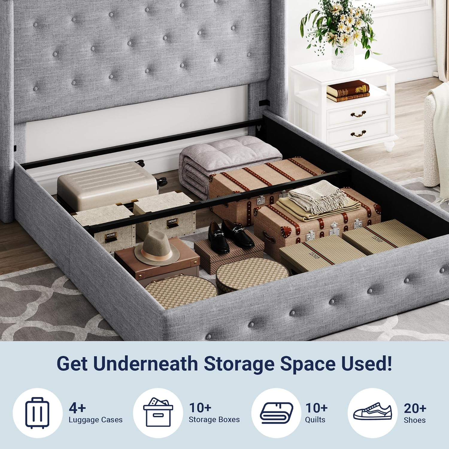Allewie Queen Size Lift Up Storage Bed, Button Tufted Headboard with Wingback, Hydraulic Support, No Box Spring Needed, Light Grey