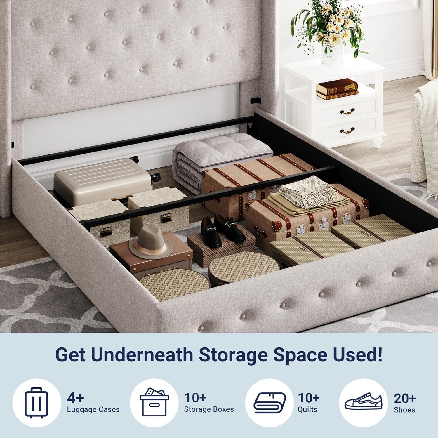Allewie Queen Size Lift Up Storage Bed, Button Tufted Headboard with Wingback, Hydraulic Support, No Box Spring Needed, Light Beige