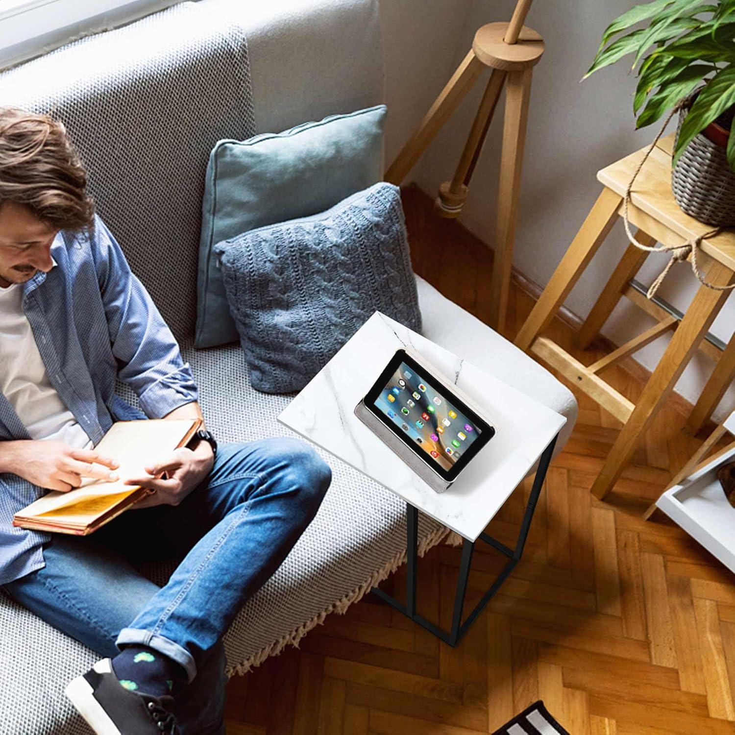 - [Strong & Stable] The strong black metal frame ensures the stability of this sofa side tables, preventing it from shaking. Itβs solid enough to support 25 lbs. The 4-leg support system adds extra stability while maintaining a minimalist style. Four adjustable feet will keep this c shaped couch table balanced on slightly uneven ground, and prevent the floor from scratching.