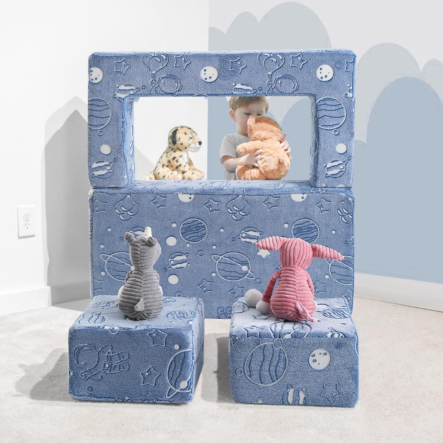 - [Sparks Imagination with Glow-in-the-Dark Space Theme] This modular play couch transforms into a chair, table, bed, fort, obstacle course, ball pit, or hideout—fueling endless creativity. The enchanting glow-in-the-dark space design adds a magical touch to playtime, inspiring your child’s imagination.