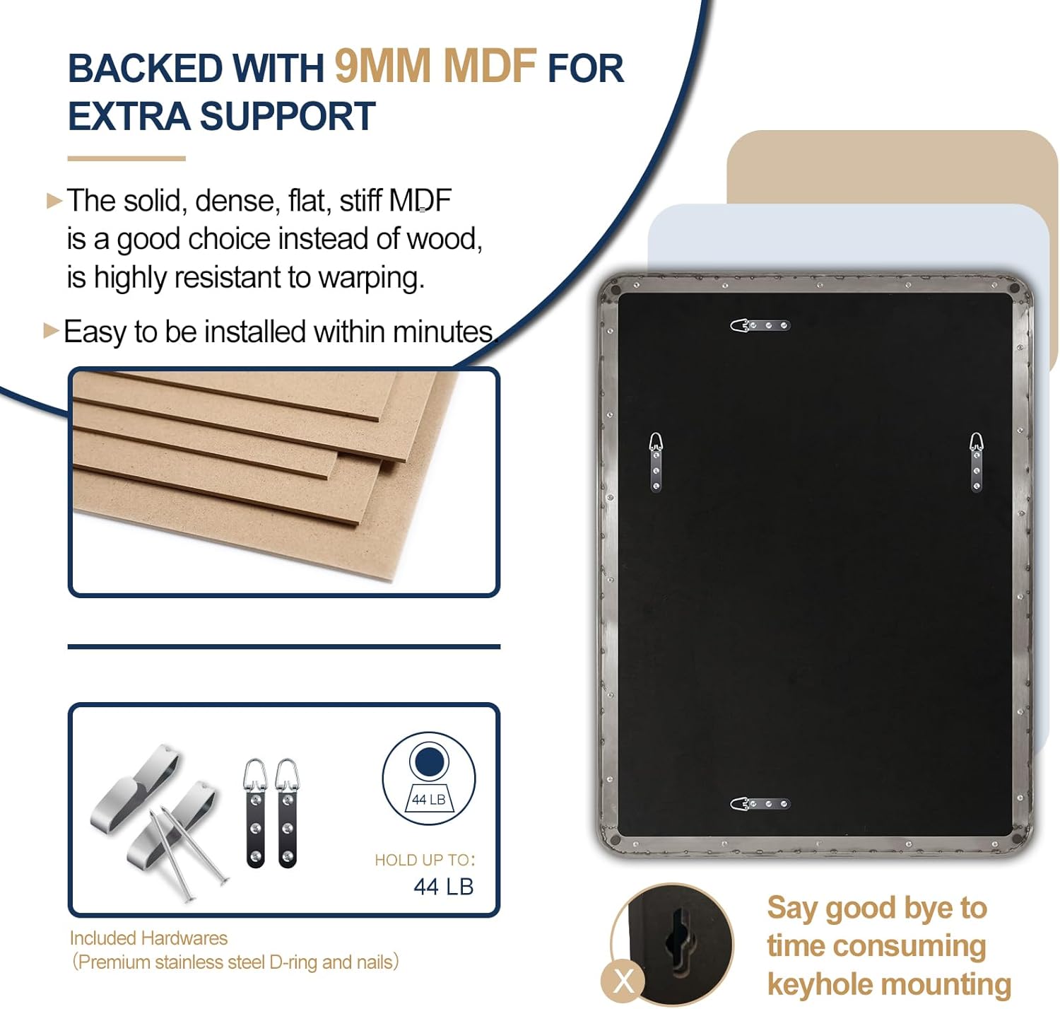 - EASY INSTALLATION: Our brushed nickel bathroom vanity mirror comes with four pre-installed D-ring hanging clips for quick and hassle-free installation. The updated hooks are sturdy enough to support up to 50kgs, and if you have any issues, we'll send you a detailed video for reference
