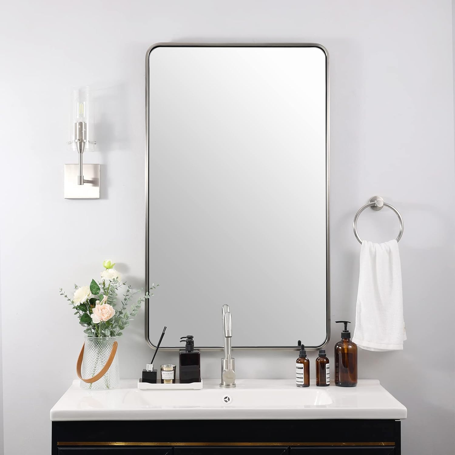 ANDY STAR 24x40'' Bathroom Mirror for Wall, Brushed Nickel Rounded Rectangle Mirror for Vanity in Stainless Steel Tube Metal Frame Antirust Wall-Mounted Horizontal or Vertical