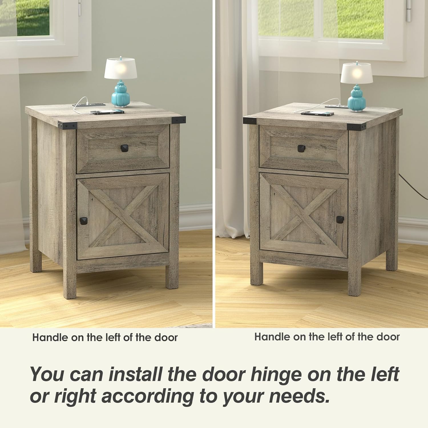 Rustic Nightstand with Charging Station, Night Stand with Barn Door and Drawer, Storage Bedroom Living Room Bedside Table Farmhouse End Table Industrial Bedside Table with USB Ports and Outlets,Grey