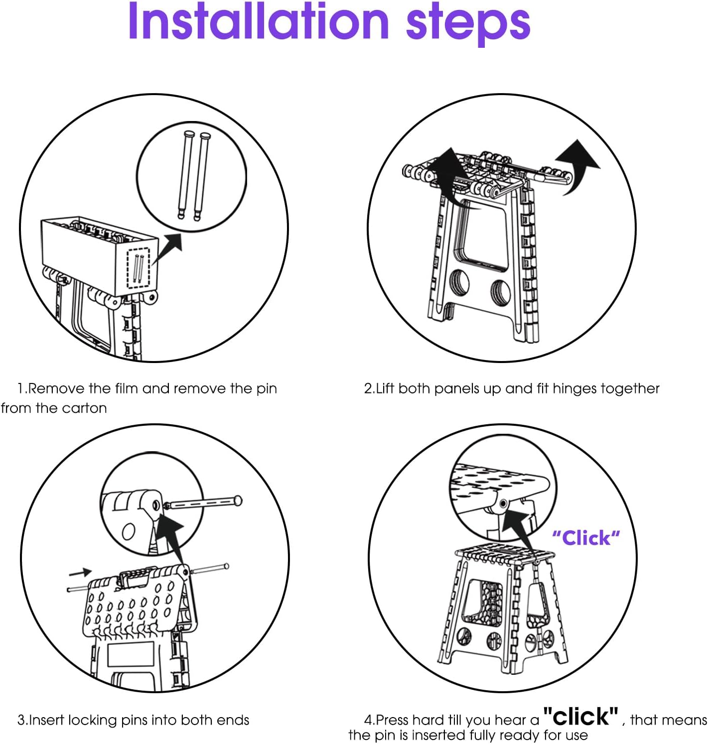 - Usage Instructions & Customer Support: Use the step stool only on dry, flat surfaces for optimal safety. Avoid exposing the product to temperatures above 30℃ (86℉) or below -5℃ (23℉) for more than 5 hours to maintain its quality. 【Tip】If your stool arrives without a pin, please contact us immediately for a replacement. For any issues or inquiries, our customer support team is always ready to assist you.