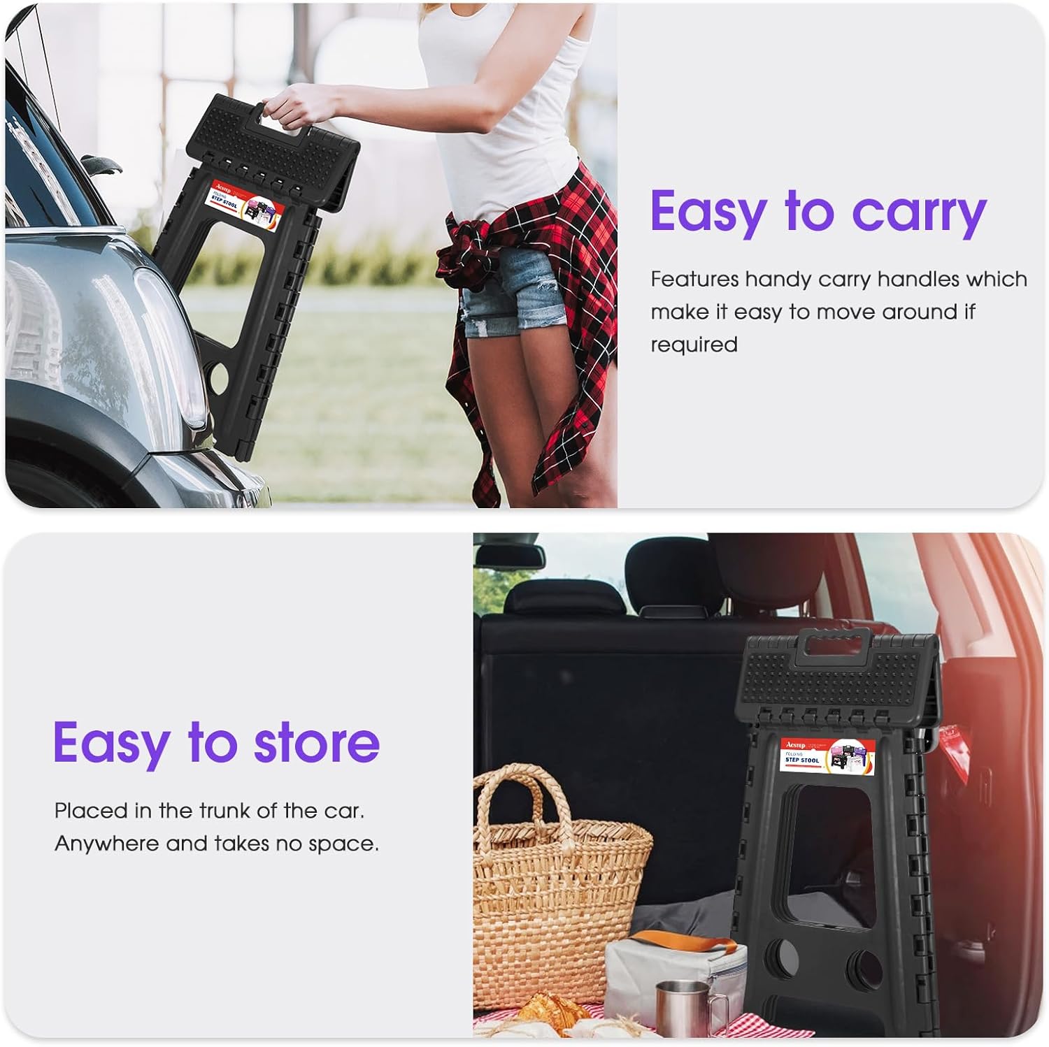 - Space-Saving & Portable: Our folding step stool is celebrated for its easy transport and storage capabilities. The foldable design allows you to carry it effortlessly to places like sporting events, camping trips, or anywhere you might need an extra boost in height.