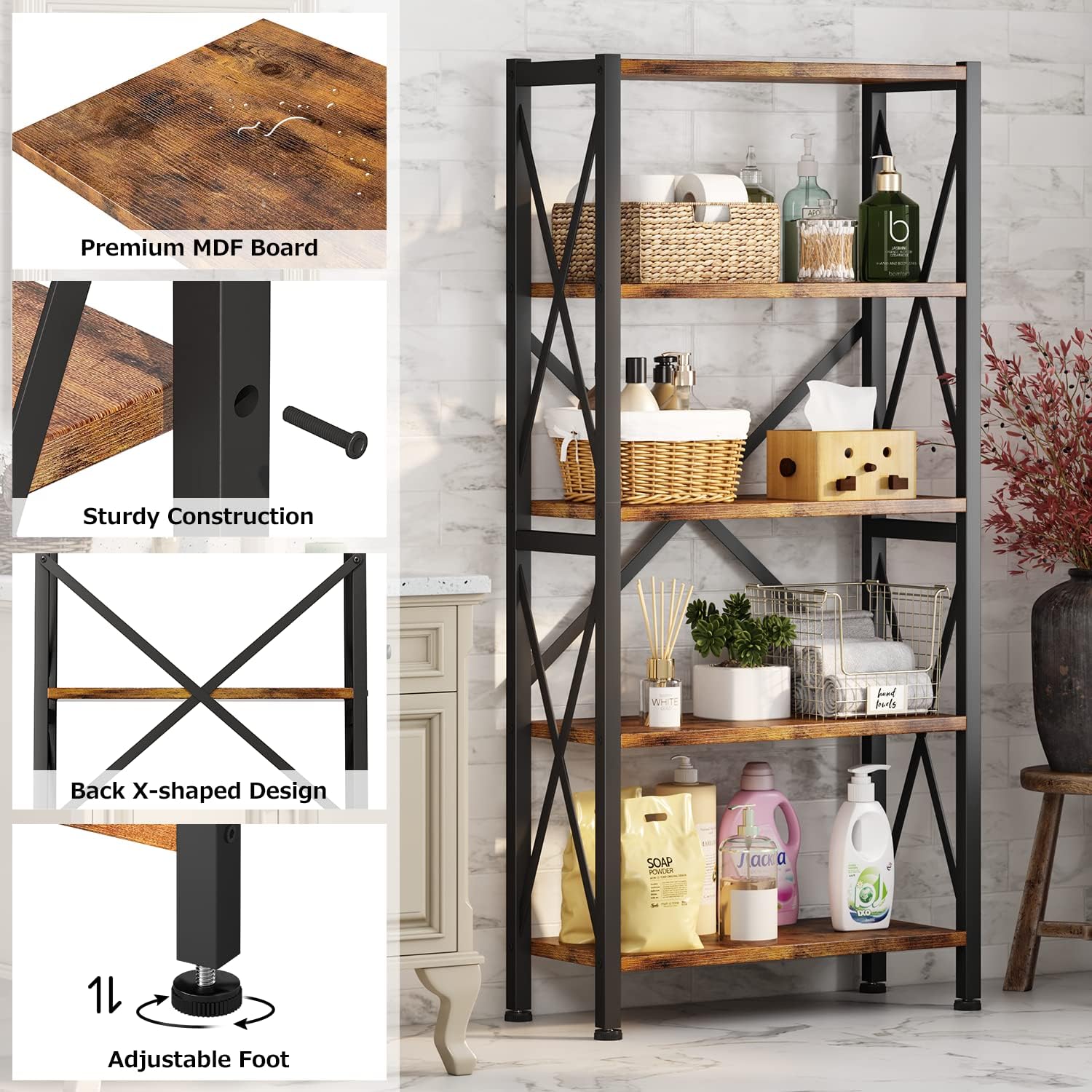 - 【Reliable 5 X-shaped Wires & Sturdy Frame】- The bookcase shelf is made of strong and thickened Iron pipe, not easy to deformation, durable, corrosion and rust resistant, as well as superior bearing capacity of at least 220 pound. The X-shaped design on the back enhance the stability of the bookshelf, and X-shaped sides effectively prevent items from falling.