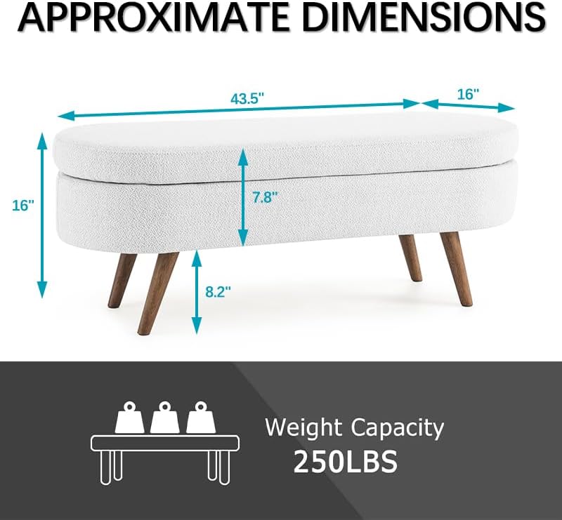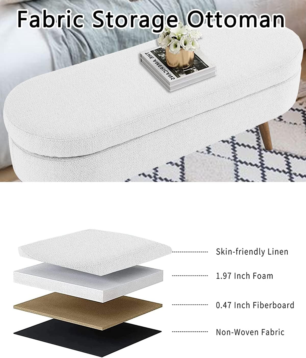 Oval Storage Bench 43.5" Linen Fabric Upholstered Entryway Bench with Solid Wood Legs Ottoman Bench Indoor Bench for Living Room/Bedroom/End of Bed/Entryway (White)