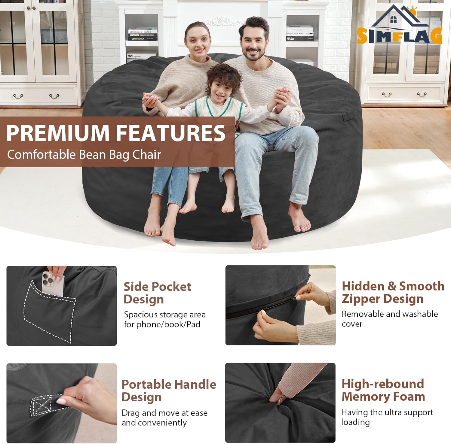 - CONVENIENT DESIGN: SIMFLAG bean bag sofa design with 4 thoughtful details, firstly, a pull-tab makes the bean bag chair easy to move around and manipulate. Second, an inter linner can contains the bean bag and allows you to wash the outside cover without spilling the beans. Third, a medium-sized pocket for your stuff. Fourth, a hidden zipper can prevent scratches to a people's delicate skin.