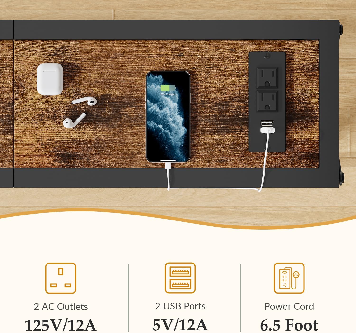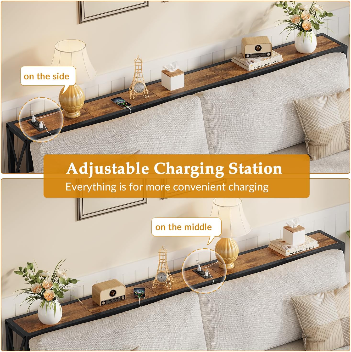 - 70" Sofa Table With Charging Station: We know what you want, the sofa table is equipped with 2 outlets, 2 USB ports and 78-inch power cord. In addition, you can place the power strip where you like by adjusting the tabletop section. Let your mobile phone, laptop, lamp and other electronic devices charge in an orderly manner
