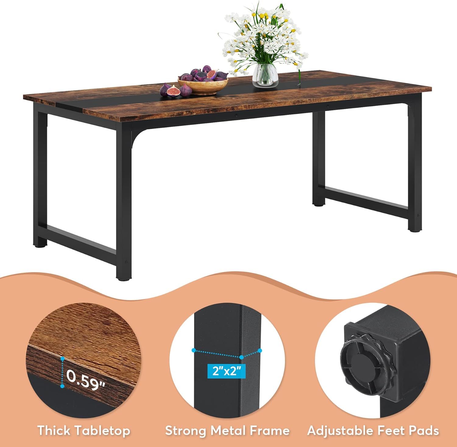LITTLE TREE 70.9 Inch Large Dining Table Rectangular Kitchen Furniture for 6 to 8 People, Brown+Black
