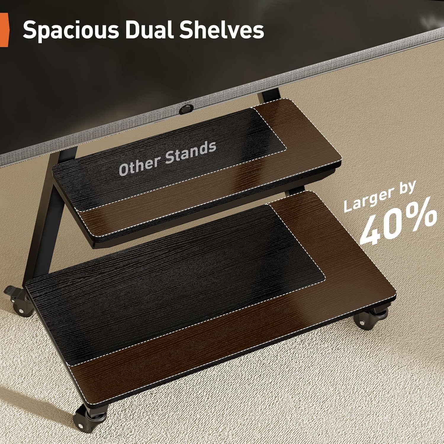- 【Enjoy Screen Mobility】The rolling TV stand has four 360° caster wheels for easy transport. Lock two of the casters to secure the cart or choose to install the four fixed feet for a stationary configuration. Dual storage shelves of this mobile TV stand provide ample space for gaming consoles and accessories.