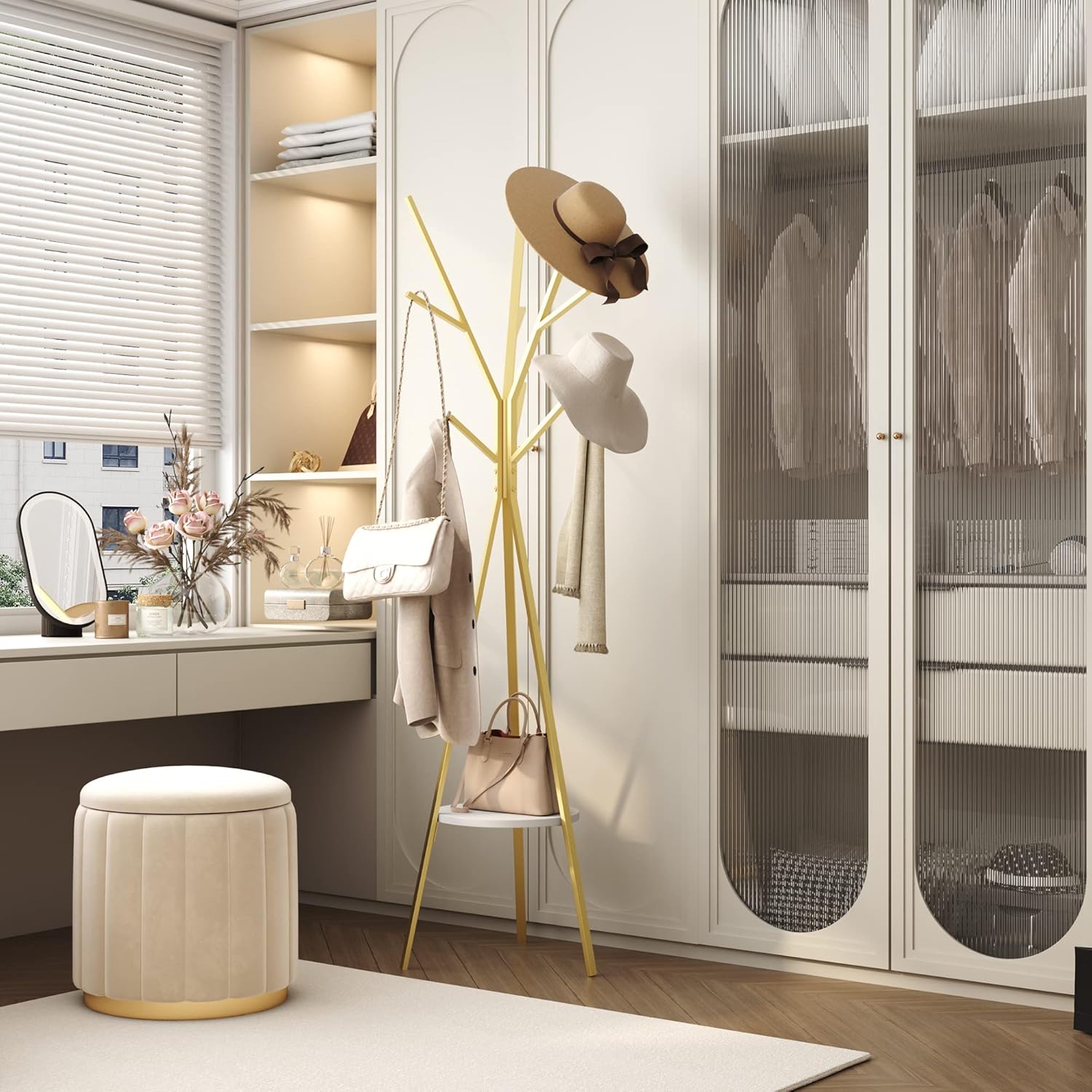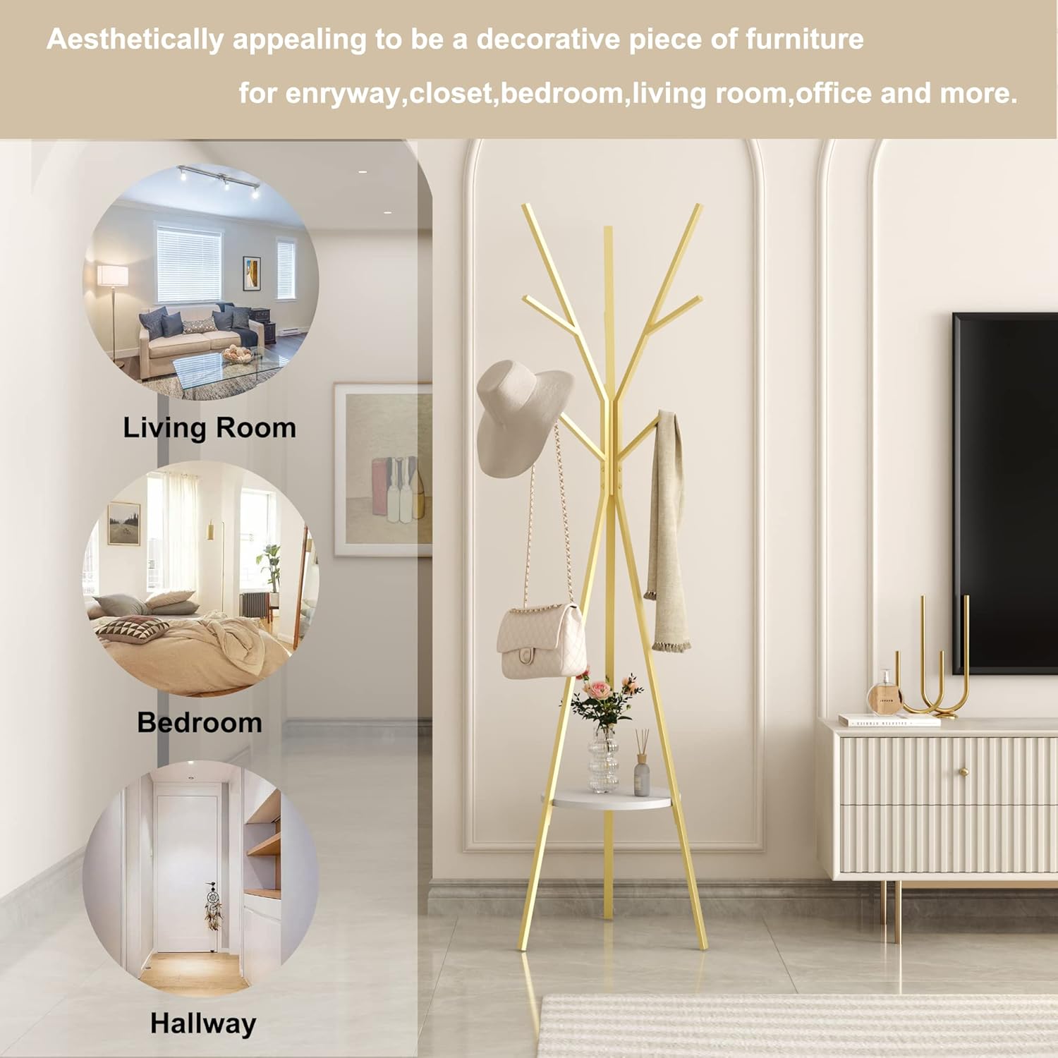 - 【Decorative and Functional Metal Coat Hanger Stand】Practical and at the same time can be a good decoration at home.Ample storage space,totally 3 main branches with 9 hooks ,this coat hat standing hanger is a perfect storage solution for coats,handbags,scarves,hockey gear,motorcycle helmets,jackets,gloves and more.The bottom circle shelf can store drawer units ,bins,toys and flowerpot as you please.