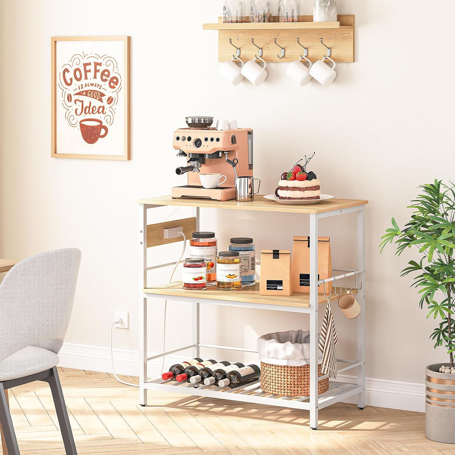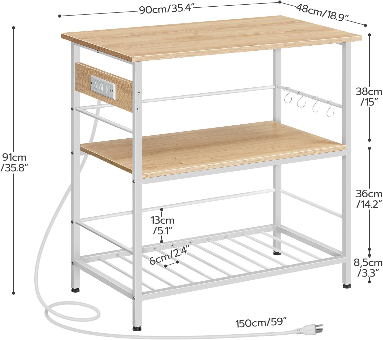 HOOBRO Kitchen Island with Storage, Kitchen Island Table with Power Outlet, 3 Tier Coffee Station and Microwave Stand, for Home, Kitchen and Dining Room, Natural and White WN021ZD01