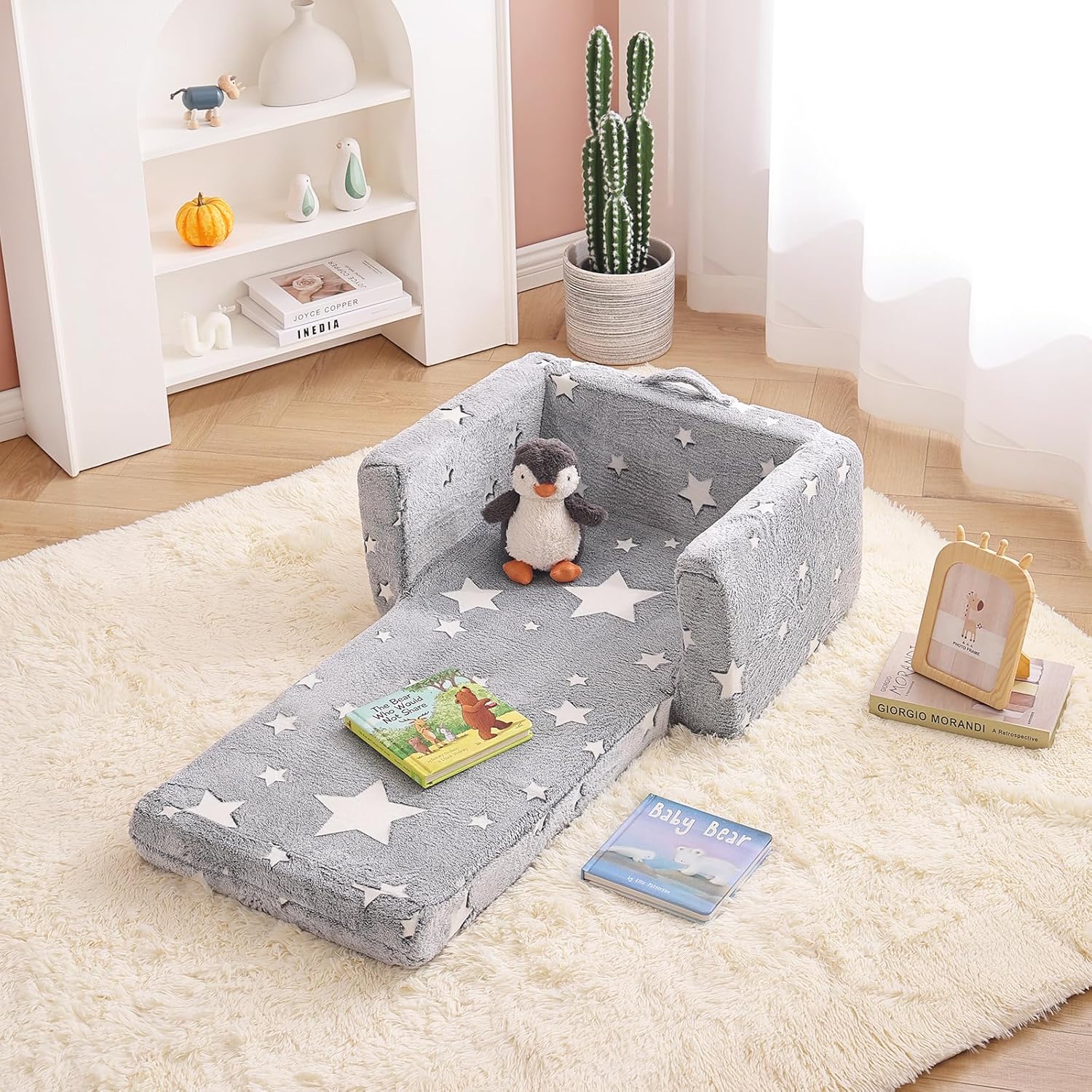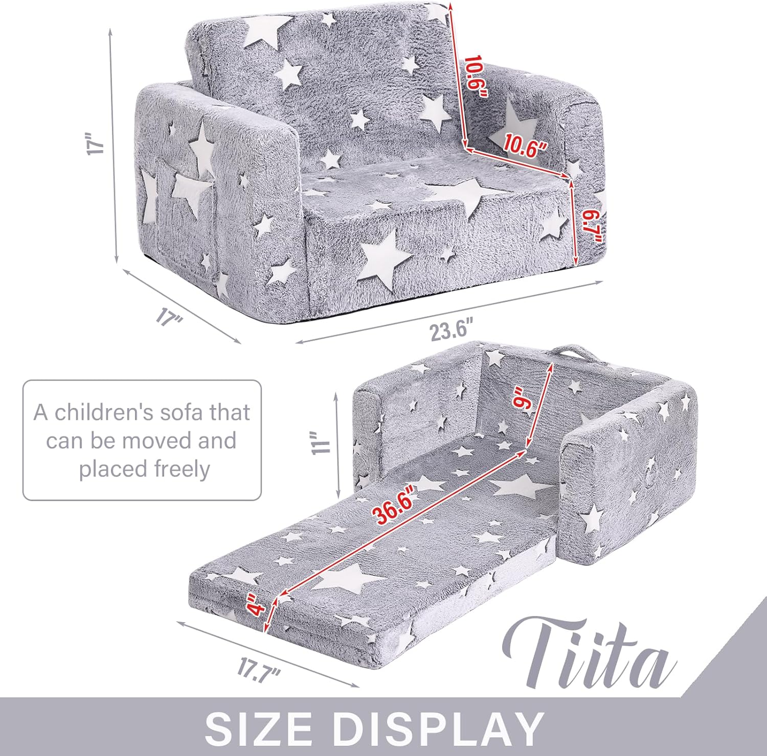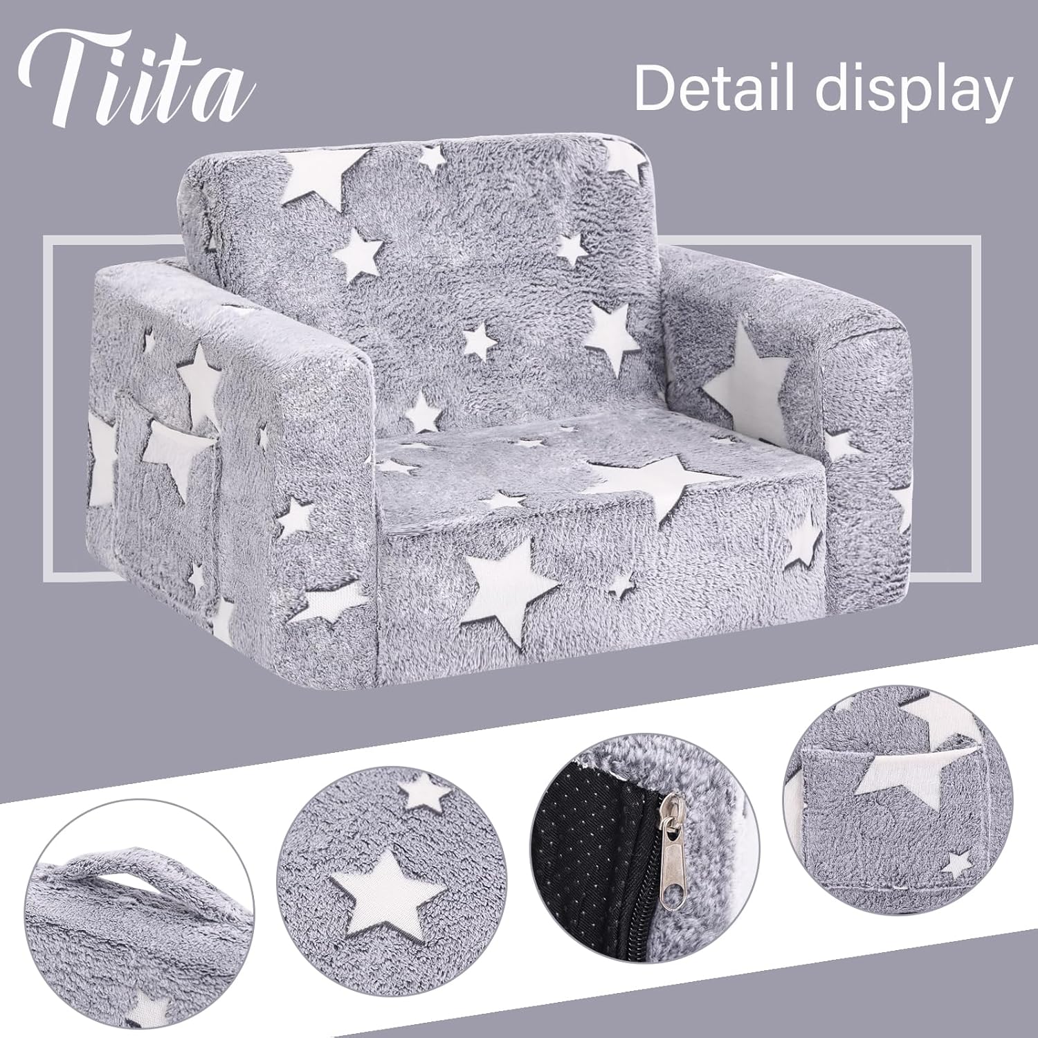 Tiita Kids Chair Couch, Folding Toddler Comfy Sofa Chairs, 2-in-1 Kids Plush Sofa Fold Out, Baby Armrest Chair Sofa to Lounger, Convertible Play Sofas to Bed for Girl or Boy, Grey Star