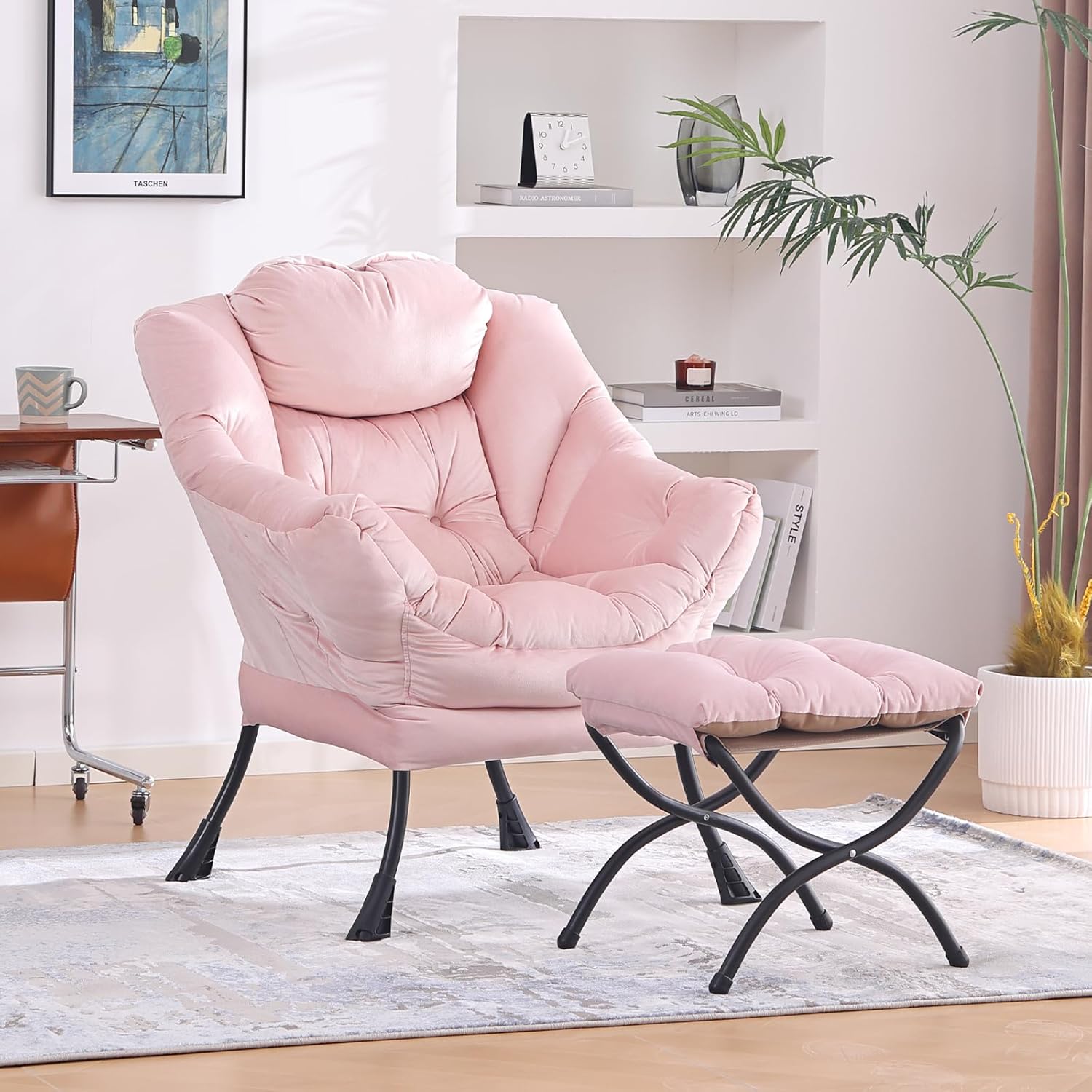 Lazy Chair with Folding Ottoman, Modern Accent Lounge Armchair with Armrests and a Side Pocket & Foldable Footstool, Leisure Reading Chair for Living Room, Bedroom, Dorm & Office, Velvet Pink
