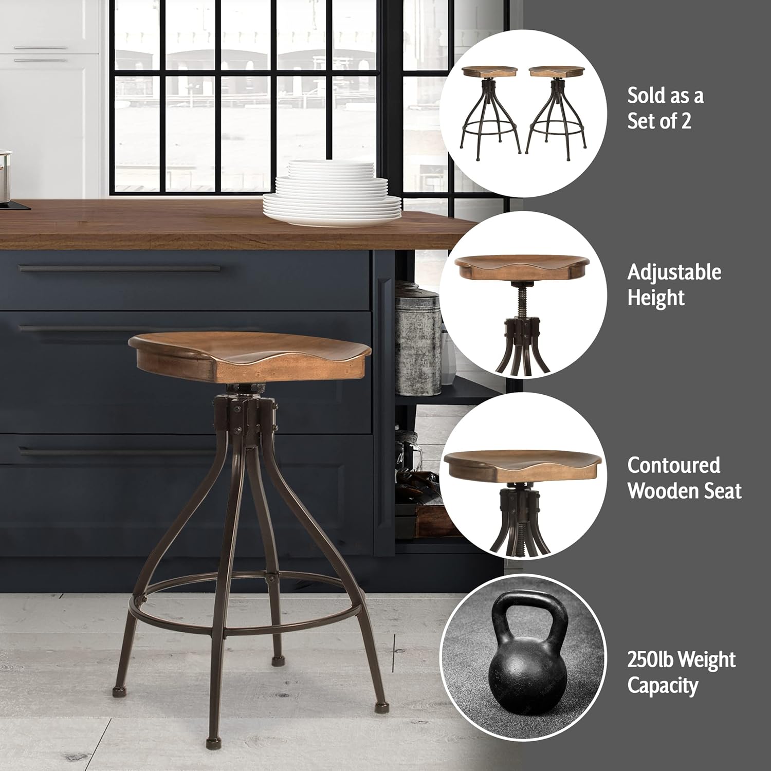 - 360-degree swivel: Industrial farmhouse wood and metal swivel adjustable height stool with a contour tractor seat – a stylish addition to any bar or counter height table. The round swivel seat allows for easy movement, keeping you in the heart of the conversation – perfect for parties or casual gatherings.