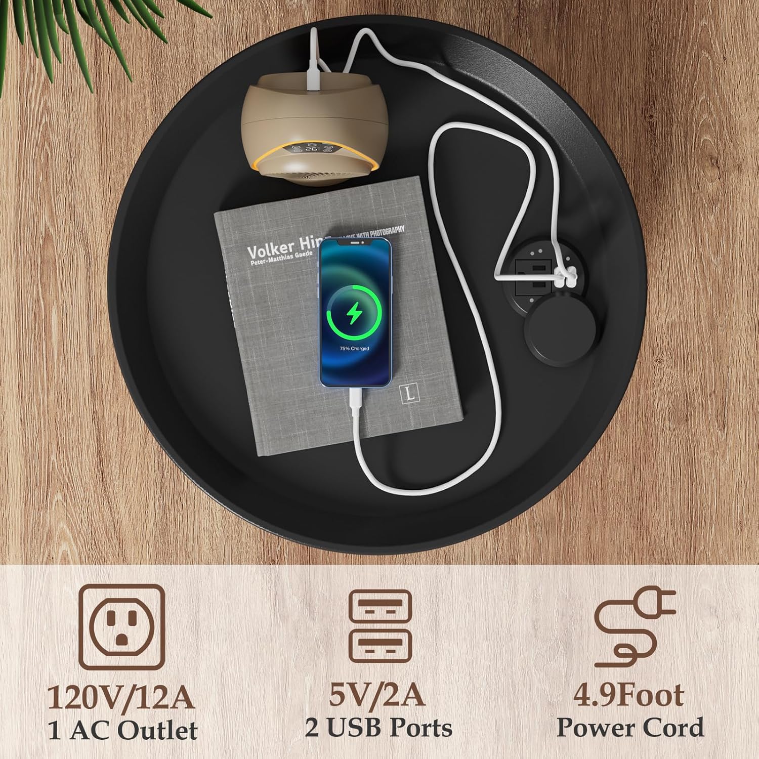 Gadroad Round End Table with Charging Station, USB Ports and Anti-Drop Fence, Wood Tabletop & Black Metal Frame, 2-Tier Side Table for Living Room, Bedroom, Black 15.7 * 15.7 * 23.0 inches