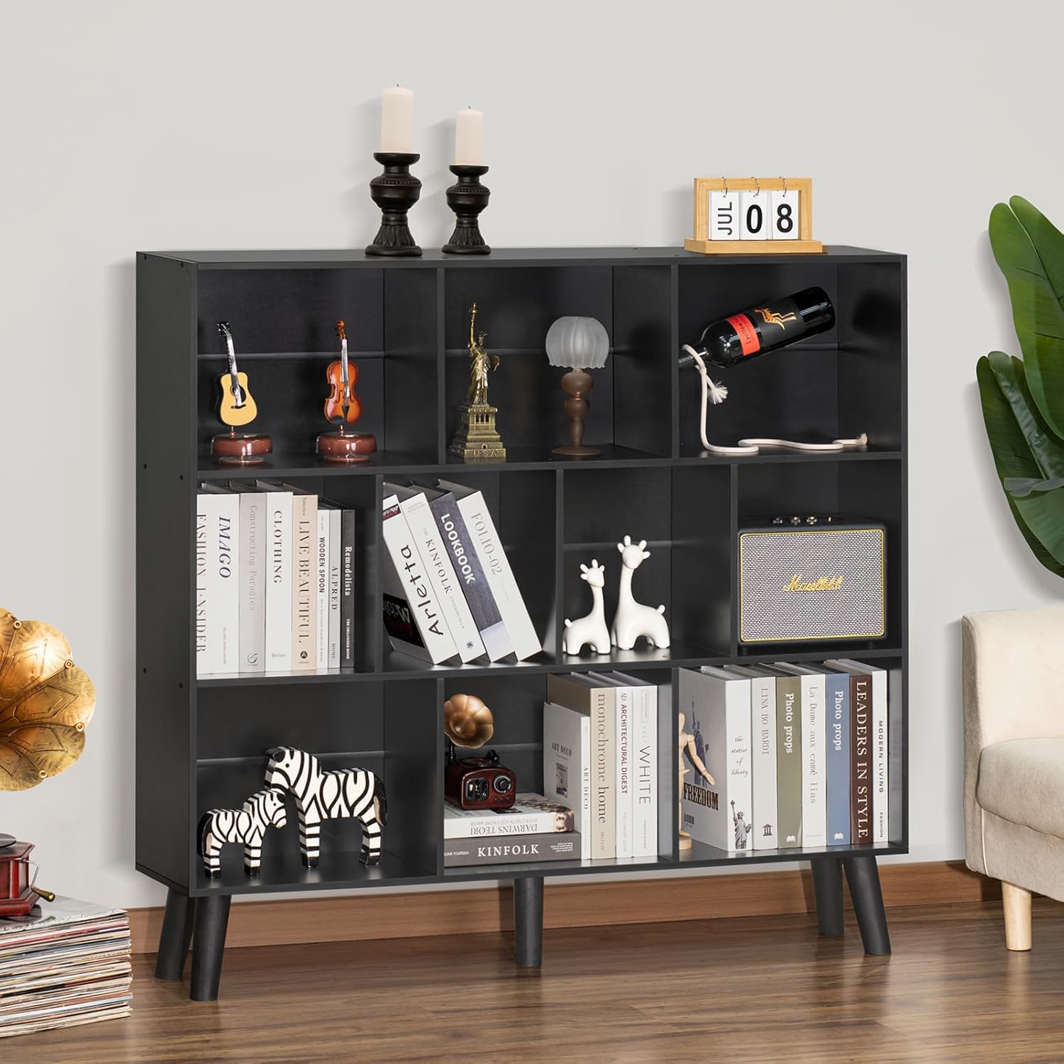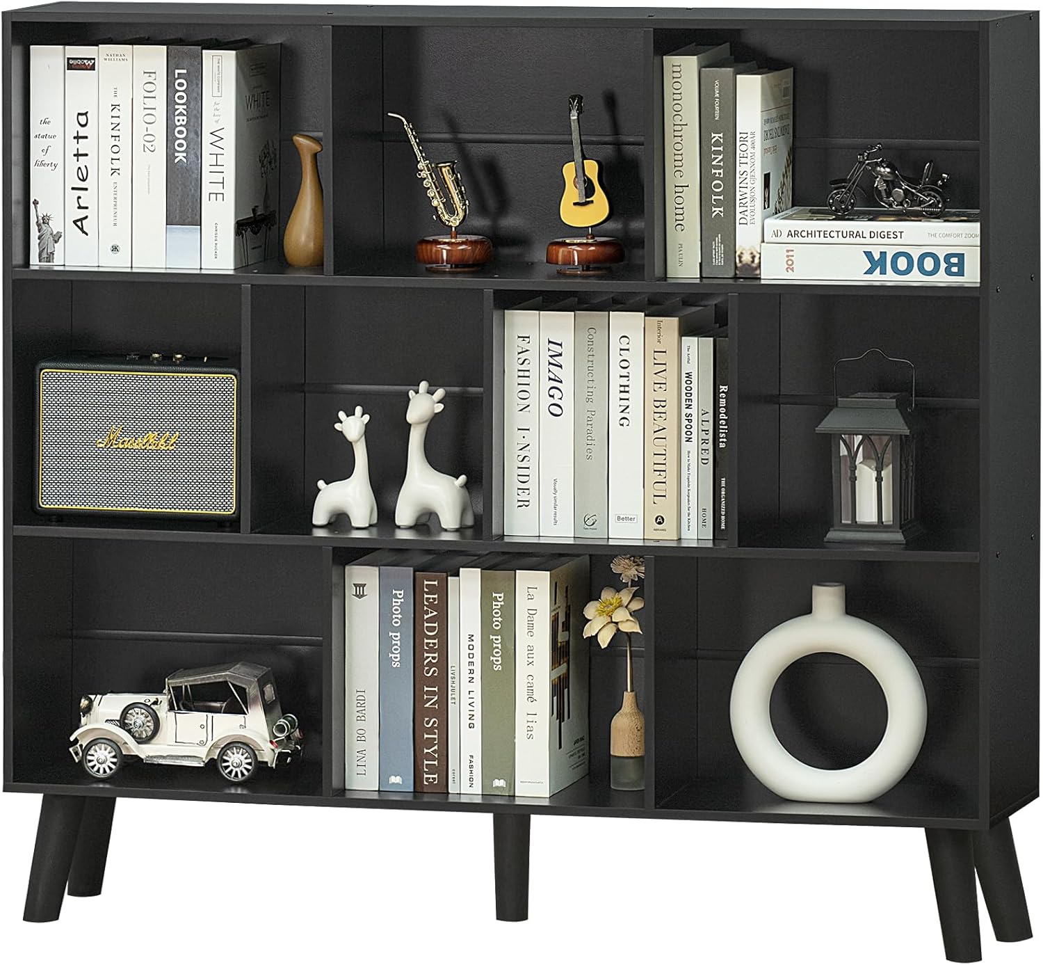 YAHARBO 10 Cube Bookshelf,3 Tier Bookcase with Legs,Black Mid-Century Modern Bookshelves,Large Free Standing Open Storage Organizer Shelf,Tall Wooden Book Case Furniture for Bedroom,Living Room,Office