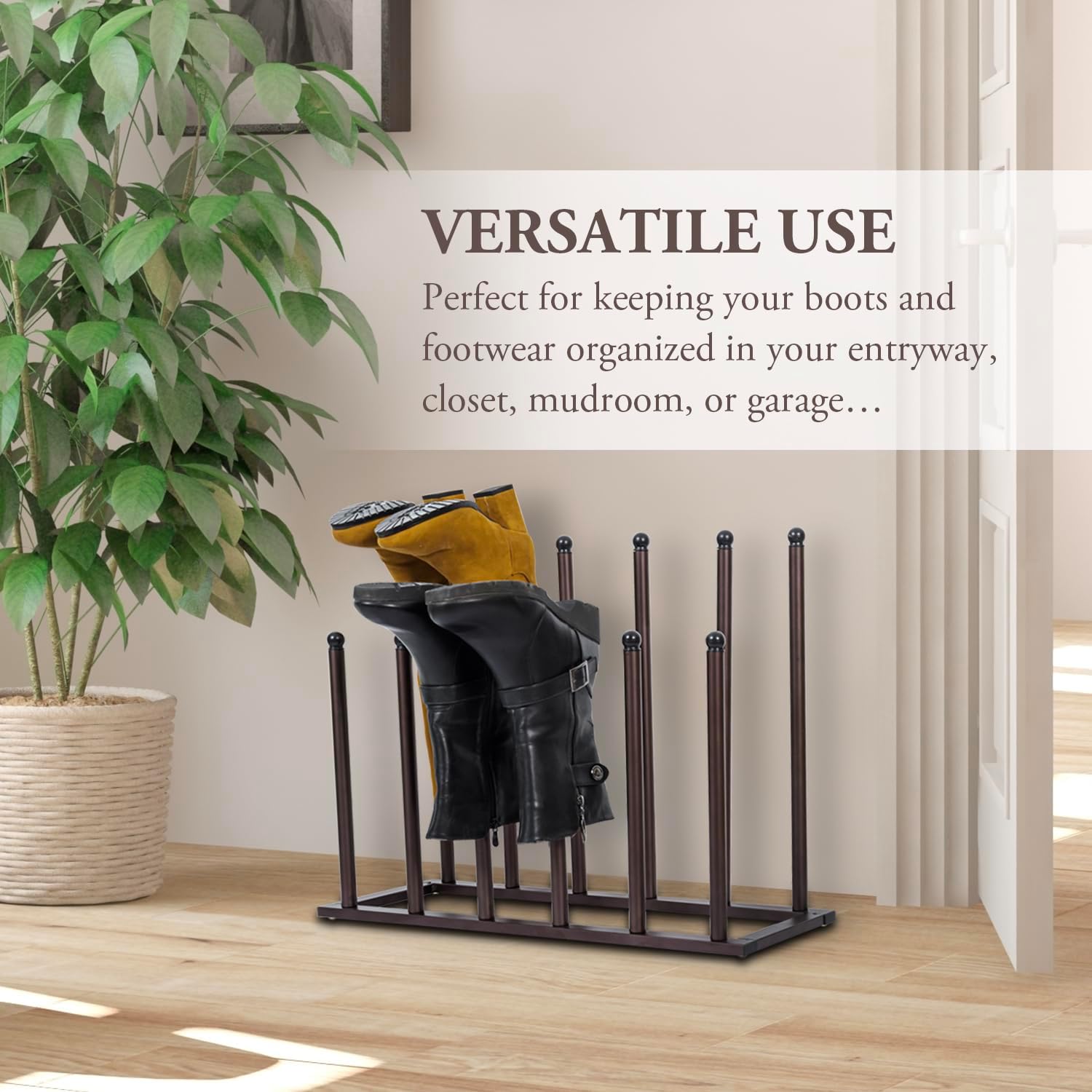 - Modern design metal footwear organizer stand with antique bronze-toned finish provides storage for tall boots anywhere in the home **Some assembly required**