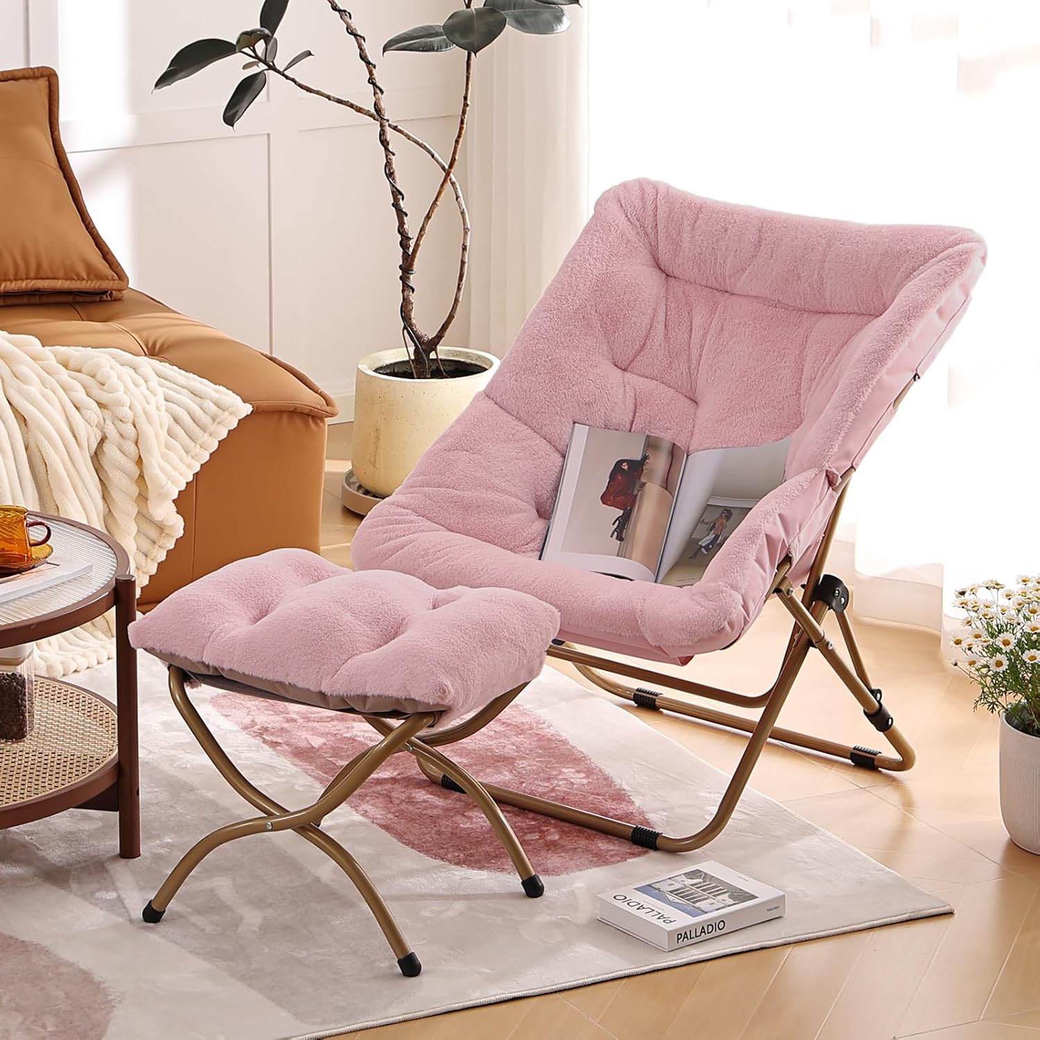 Comfy Folded Chair with Ottoman, Oversized Folding Faux Fur Chair Soft Furry Lounge Lazy Chair with Metal Frame Moon Chair Accent Chair for Bedroom, Living Room, Dorm Rooms
