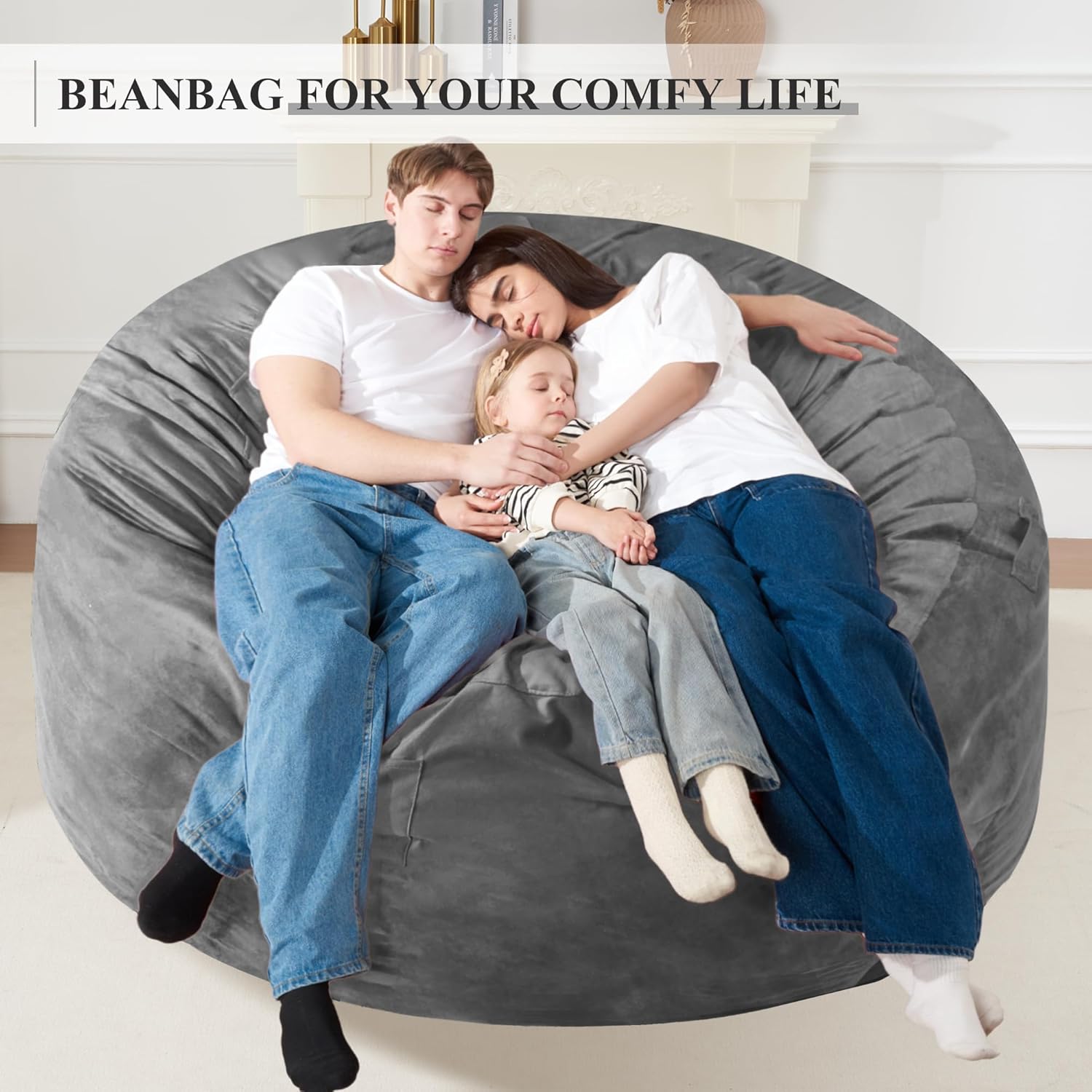 Homguava 6FT Bean Bag Chair Giant BeanBag with Memory Foam Filled, Large Bean Bag Chairs for Adults, Adult Bean Bag Chair with Dutch Velvet Cover for Living Room Bedroom-Grey
