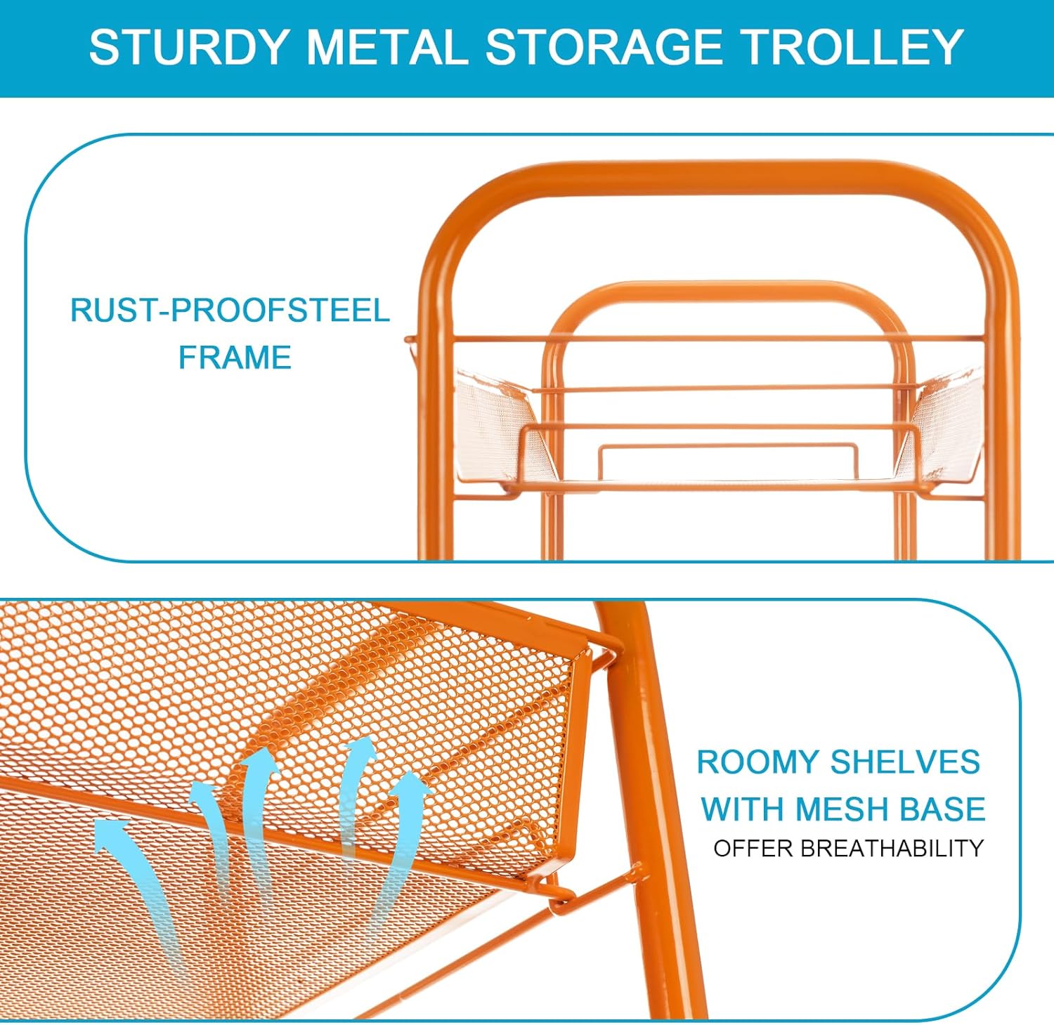 3-Tier Metal Rolling Cart, Storage Shelf with Lockable Caster Wheels, Mobile Storage Cart Used for Kitchen, Bathroom, Livingroom(Orange)