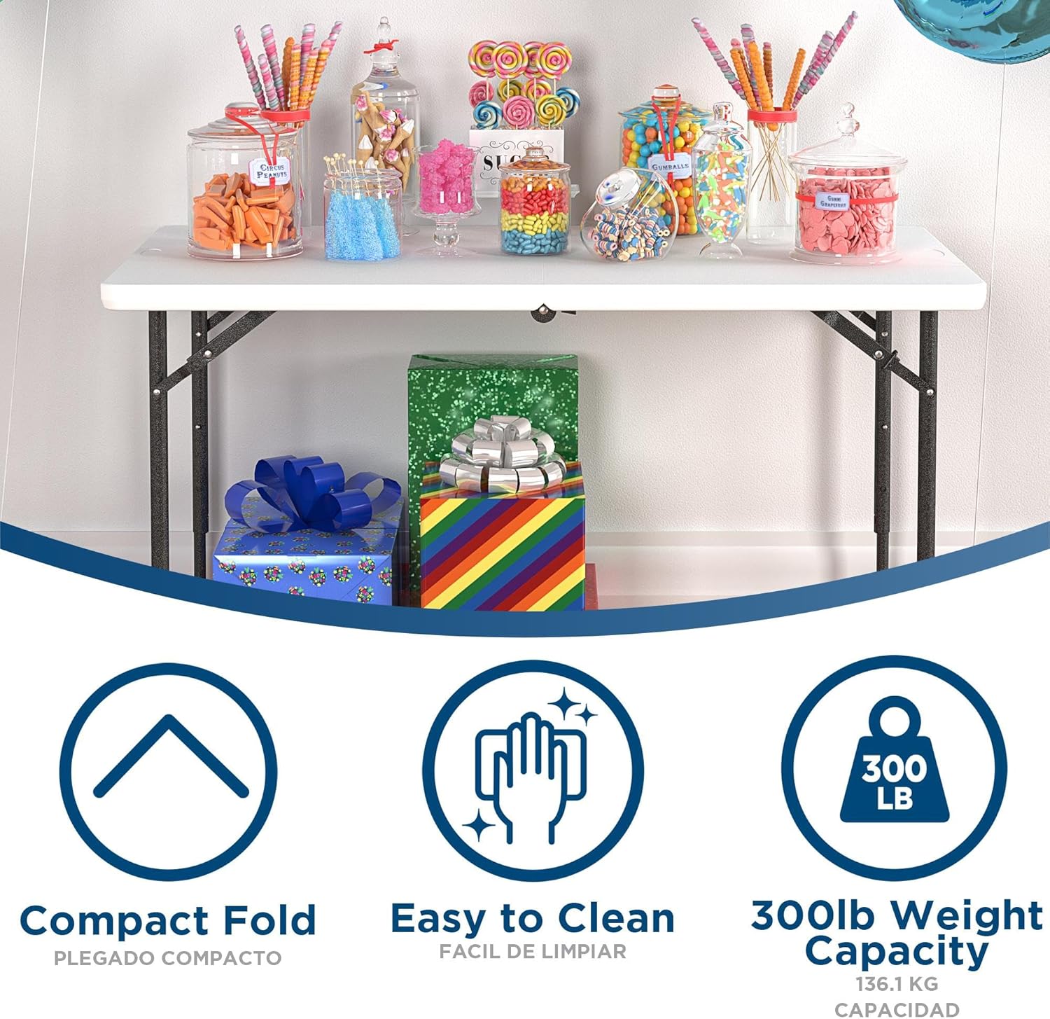 - Lightweight, centerfold design makes this table easy to transport and carry. Easy to store in a closet or vehicle with compact 3" H x 24.8" W x 24" D closed dimensions
