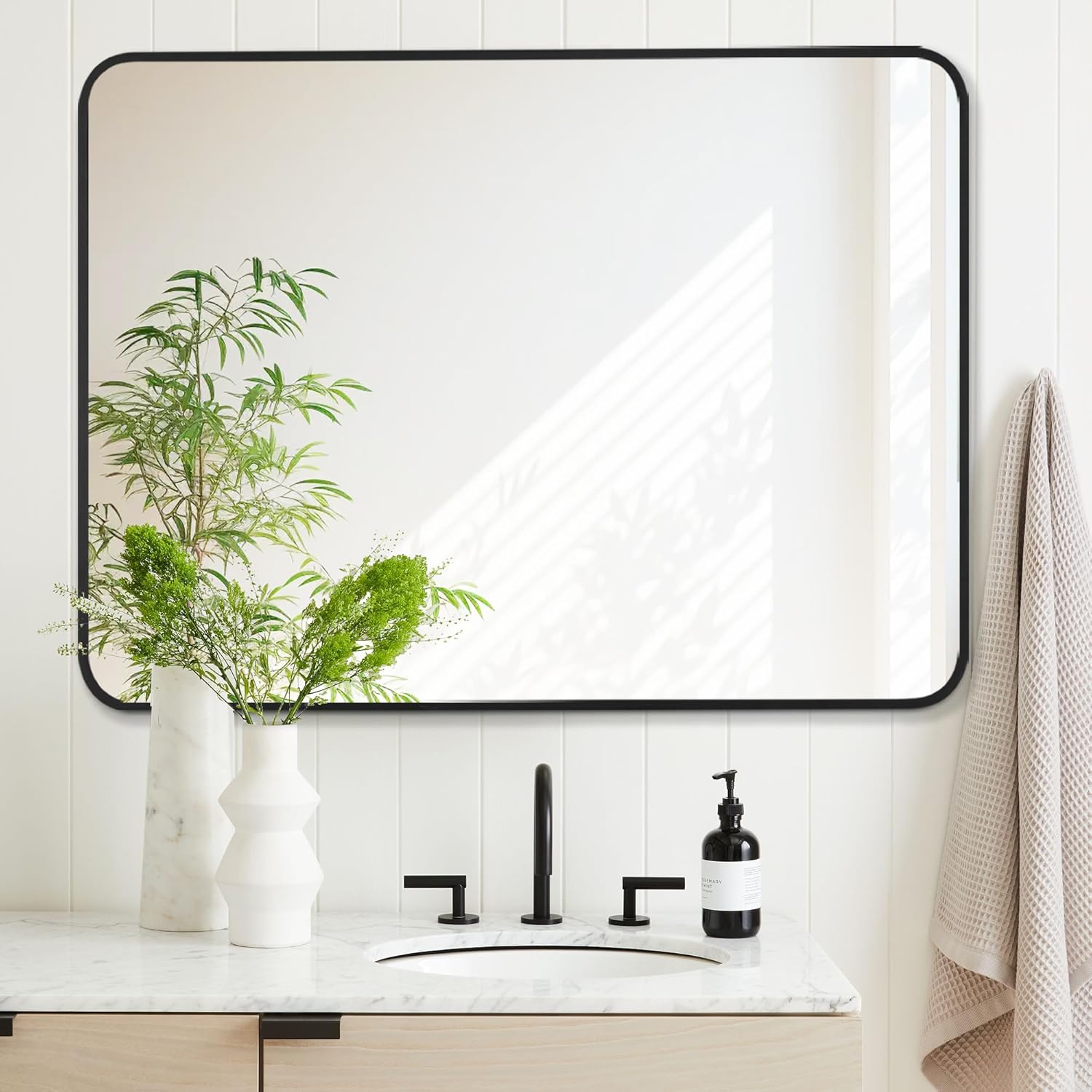 24x32 Inch Rectangle Bathroom Mirror with Black Metal Frame, Rounded Corner Rectangular Vanity Mirror for Wall, Modern Large for Bedroom, Living Room, Horizontal or Vertical