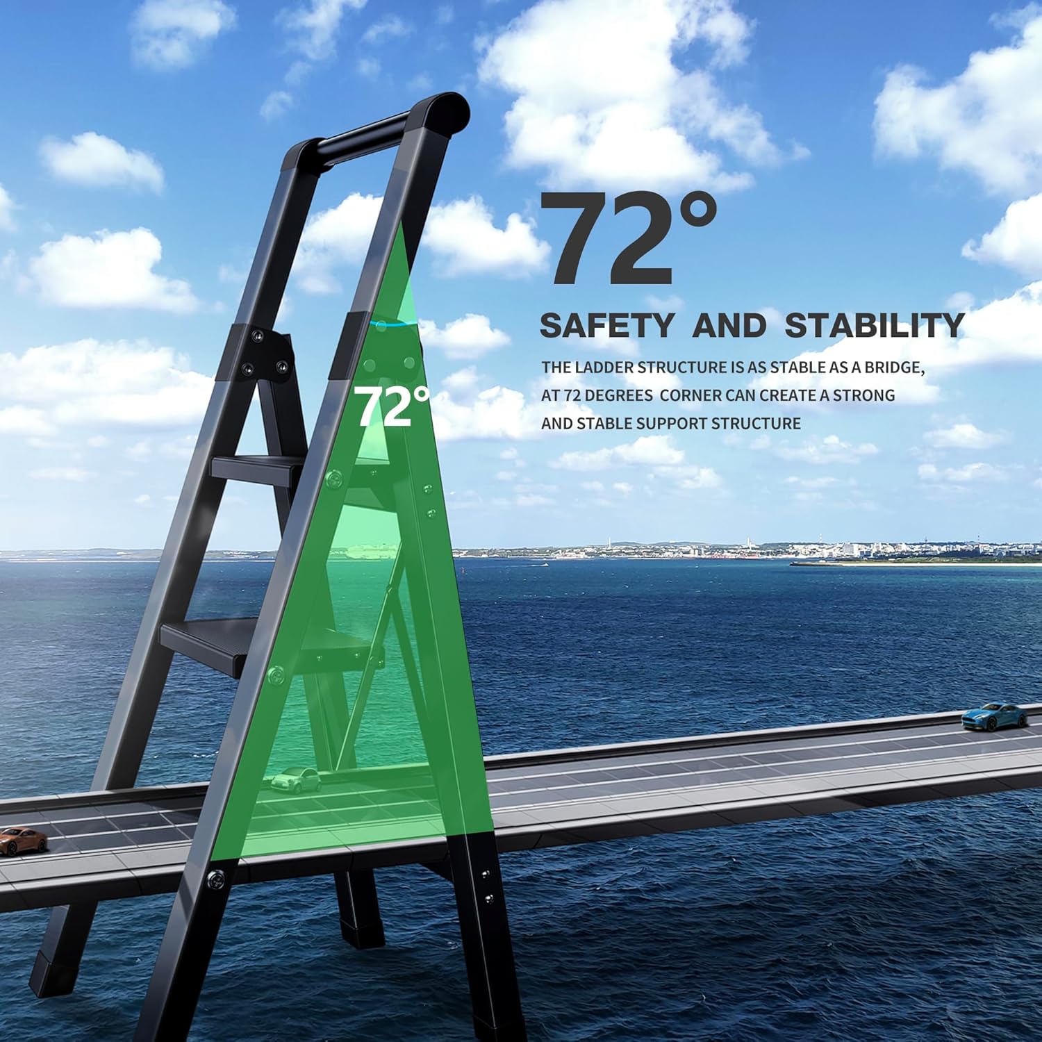 - 【Anti-Slip & Wider Pedal】Aluminum frame of the folding step stool is constructed with durability and the side cross brace structure strengthens the basic support. Wide Pedal providing ample space to stand on comfortably and securely. The surface of the pedal is designed with prominent lines to prevent slipping.