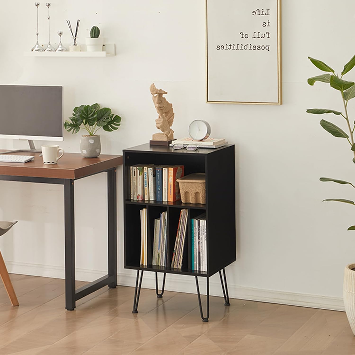 - 【Exquisite and Practical】The Leesingdo record player table seamlessly merges classic hairpin legs and vintage brown wood panels, add a sense of sophistication to your home life. Its five open shelves aim to cater to your individualized requirements for turntable storage. If you have an affinity for mid-century modern design, this vinyl record player stand is the ideal option for you.