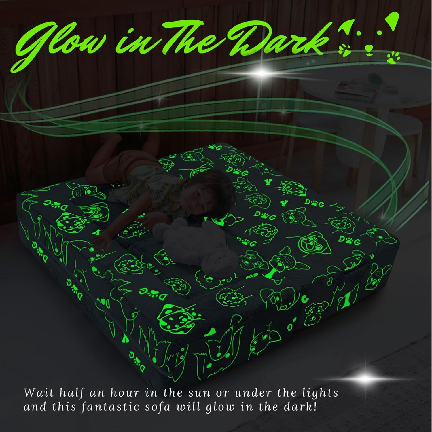- [Unique Glow-in-the-Dark Design] Expose the couch to bright light for 10–15 minutes, then watch it glow with a magical night sky and dinosaur pattern in the dark. The brighter the light, the stronger the glow. An ideal gift for birthdays, Christmas, and baby showers.