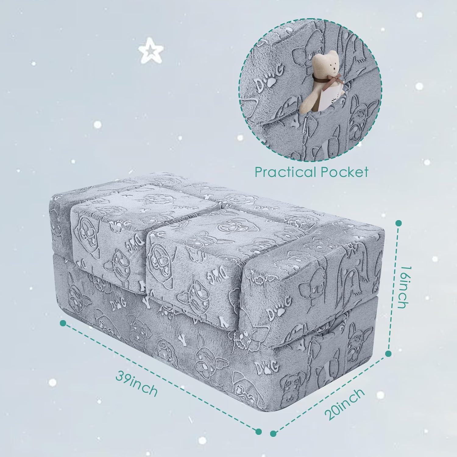 MeMoreCool Kids Sofa Couch, Glow in Dark Toddler Chair Fold Out, Modular Play Couch for Playroom, Child Foam Blocks Convertible Baby Furniture (Glowing Dogs)