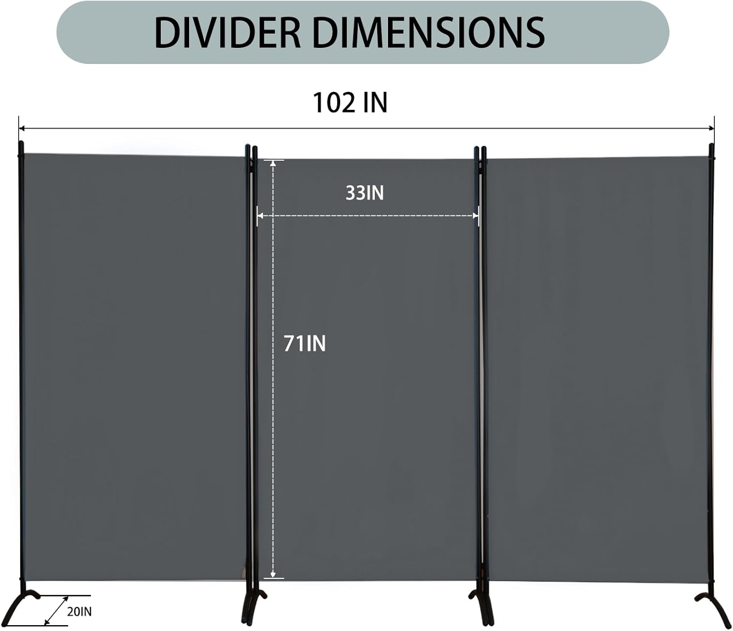 Room Divider 3-Panel Privacy Screen, Portable Screen Steel Frame with Hook&Loop for Home, Office, Classroom, Studio, Meeting (Grey