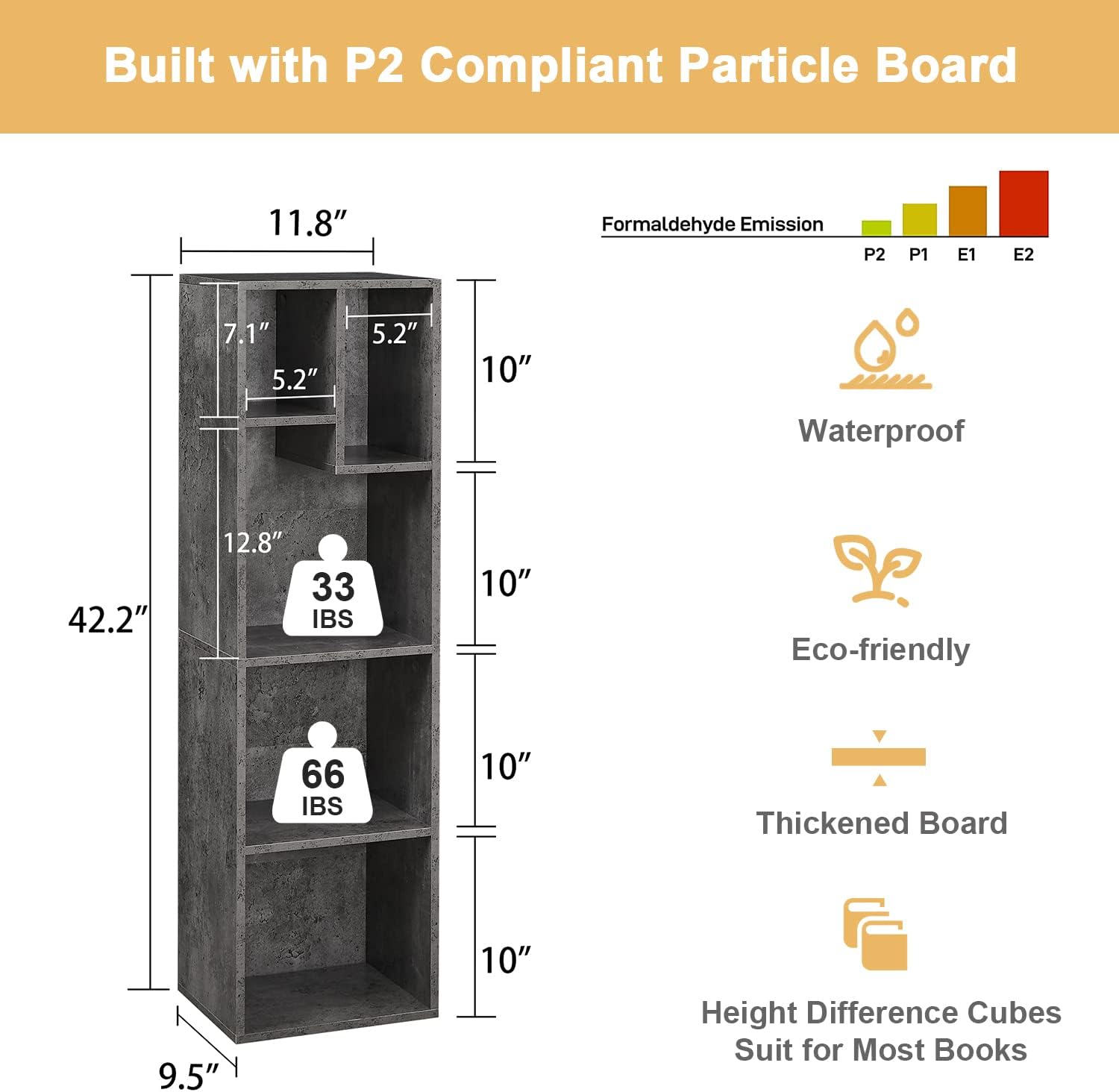 VECELO 4-Tier Bookcase, Modern Storage Cabinet with Height Difference Shelves for Standard Textbooks, 5 Cubes, Vertical or Horizontal, Easy Assembly, Grey
