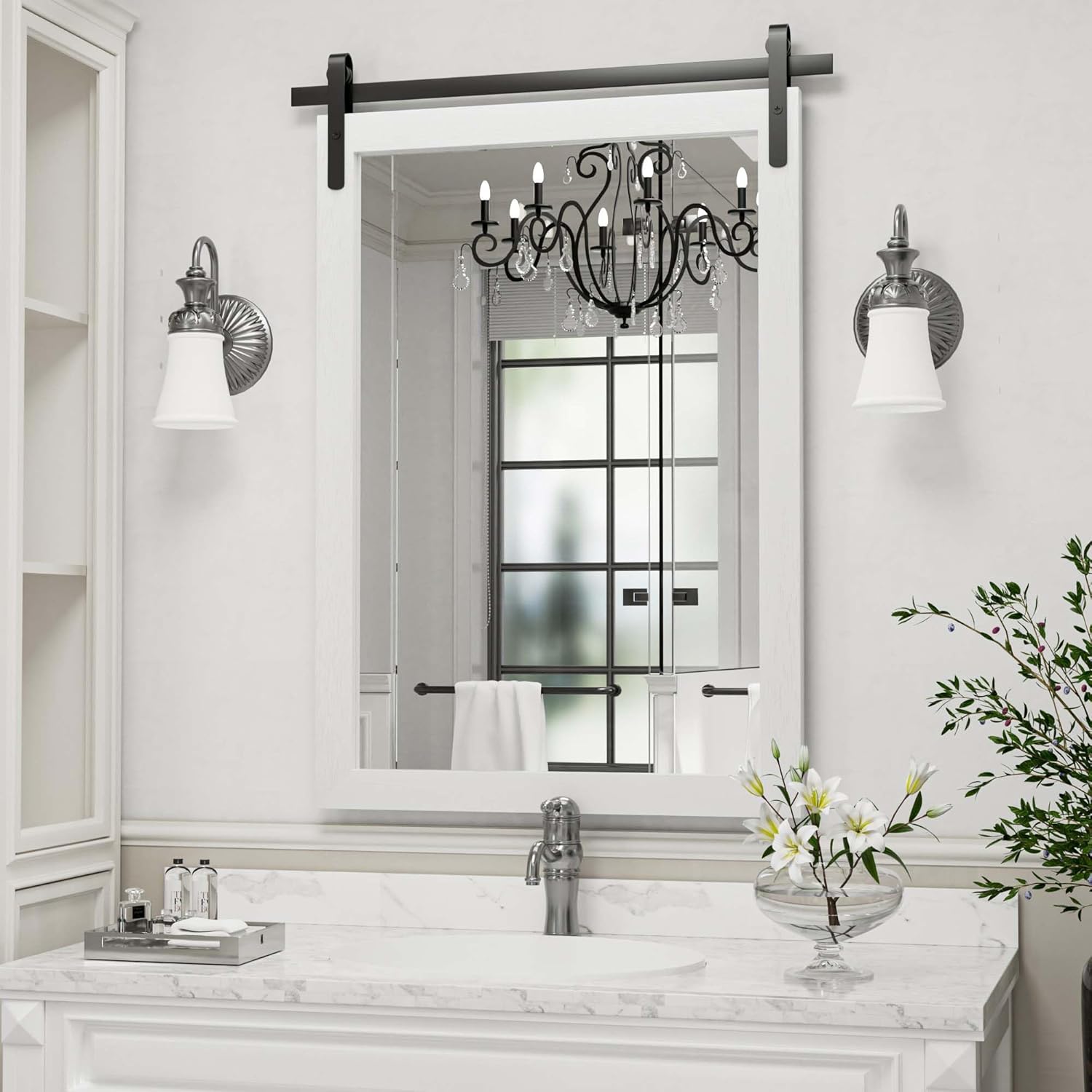 Farmhouse Bathroom Mirror, White Rustic Square Mirror for Wall Wood Framed Vanity Mirrors, Barn Door Style Decor Living Room Entryway Bedroom Mirrors, 24x36INCH (Hanging/Leaning)