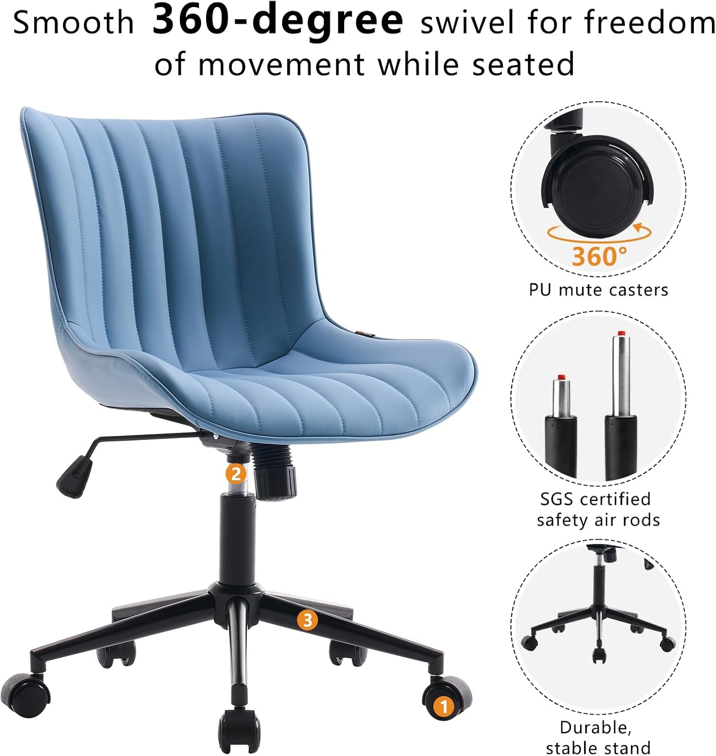 YOUNIKE Blue Home Office Desk Chair with Wheels Compact Comfy Armless Vanity Chair with Back Modern Small Leather Upholstered Rolling Task Chair Cute Computer Drafting Sewing Chair Swivel Adjustable