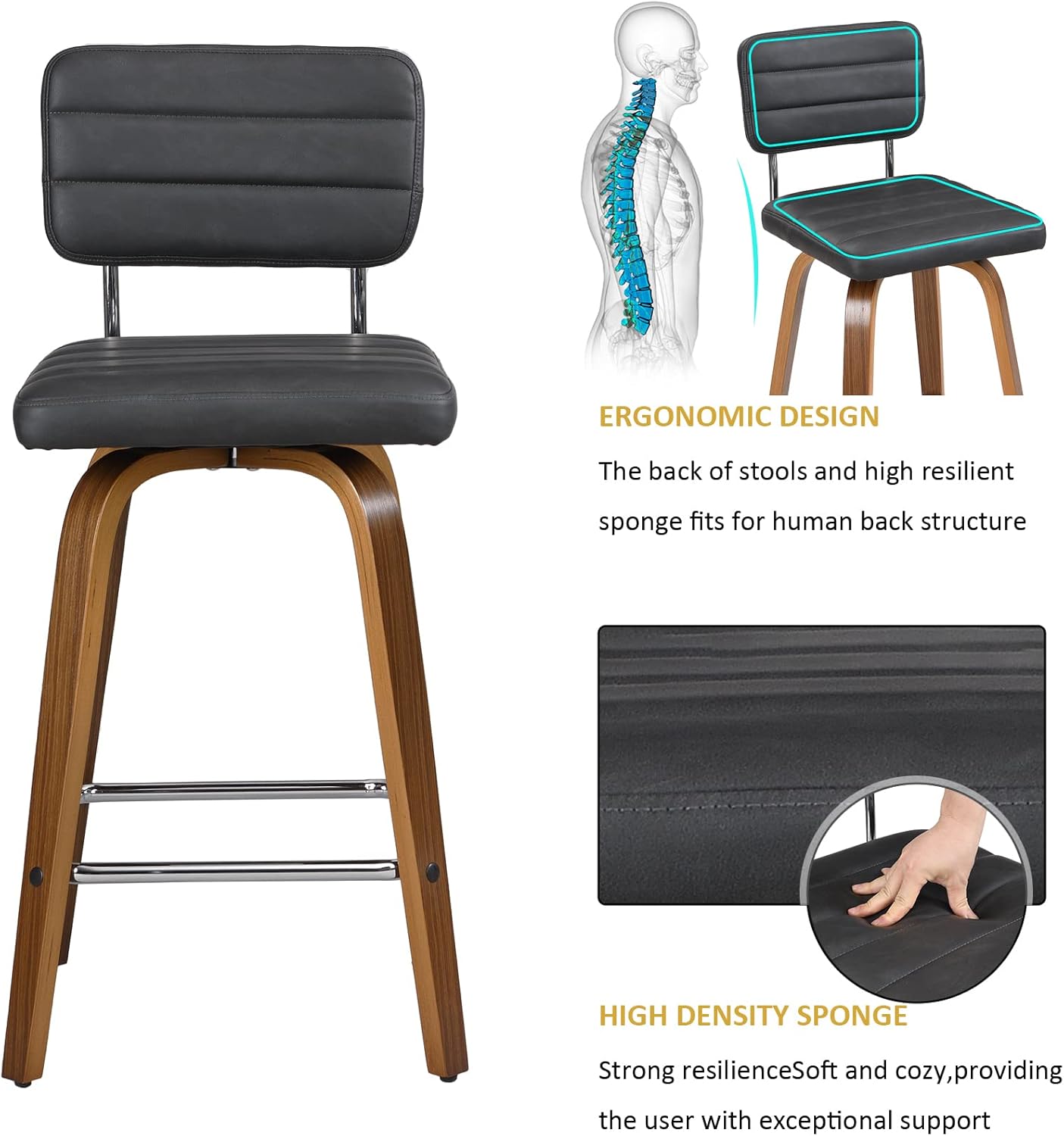 - 【Multi-scene Application】Swivel bar stools are made of bentwood stool legs, sturdy metal frame and PU leather cushions, This high bar chair is the ideal bar stools for kitchen, living room, dining table, restaurant, bistro, coffee bar, counters island, bar, pub, exhibition, cafe, etc.