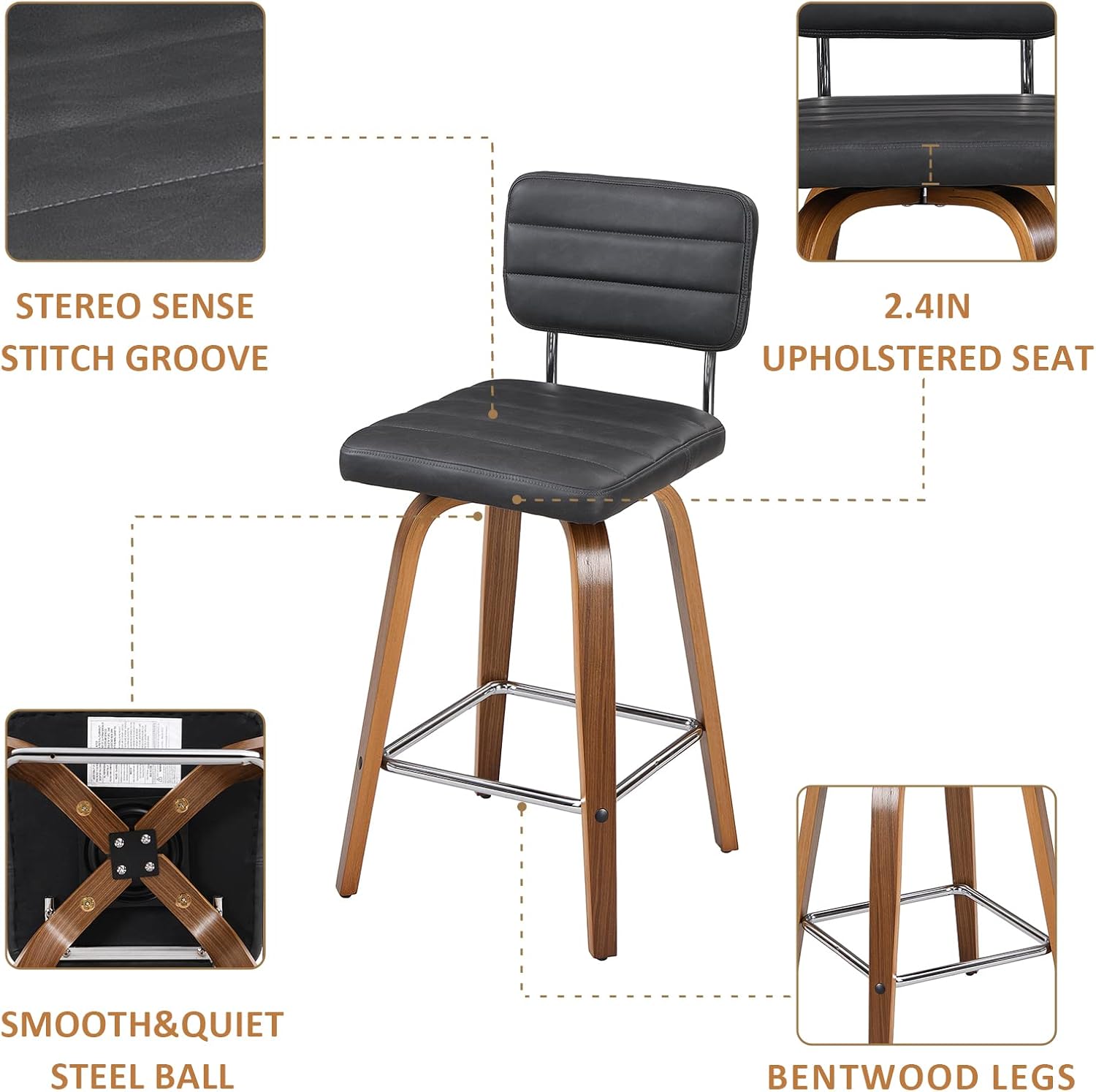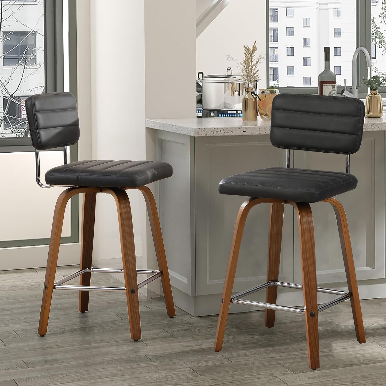- 【Ergonomic Design】The streamlined upholstered backrest and seat design provide a comfortable sitting posture, you can lean against the back of the counter height bar stools and put your legs on the footrest to relax. Modern and classic design of the swivel stool chair fits in with both contemporary and traditional decor.